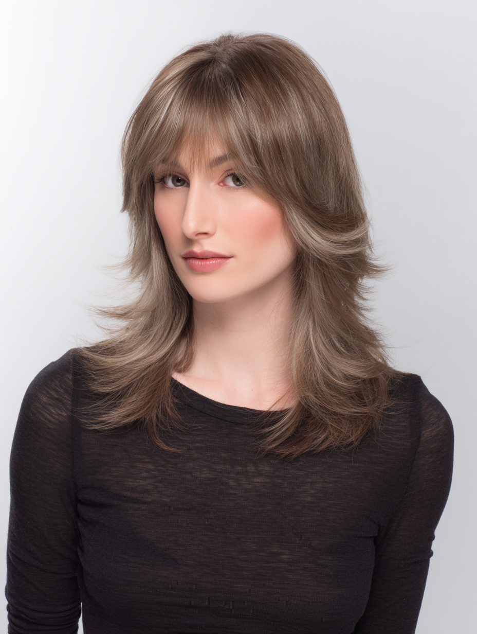 Layered bangs add softness across the forehead and blend smoothly into the sides.