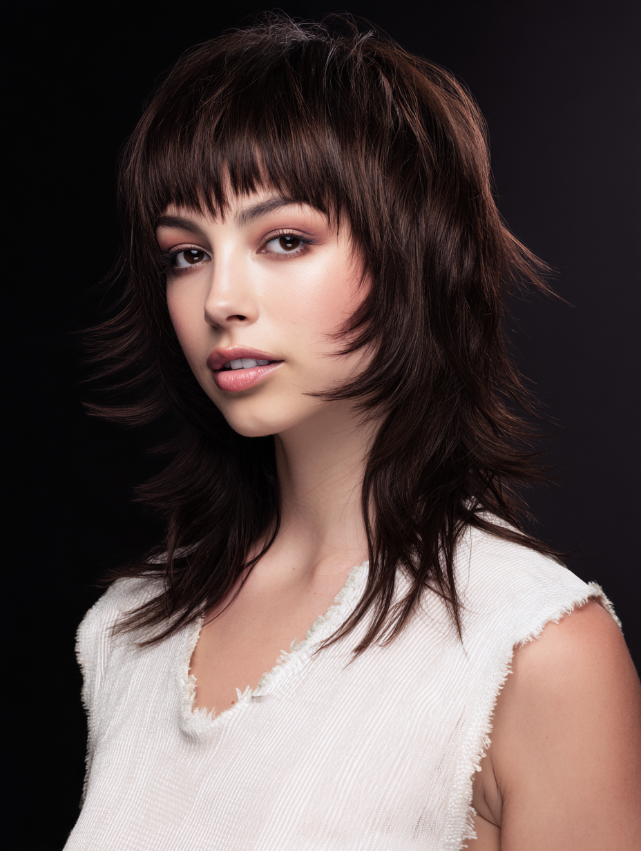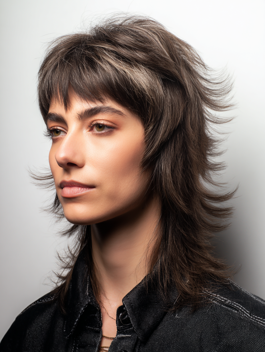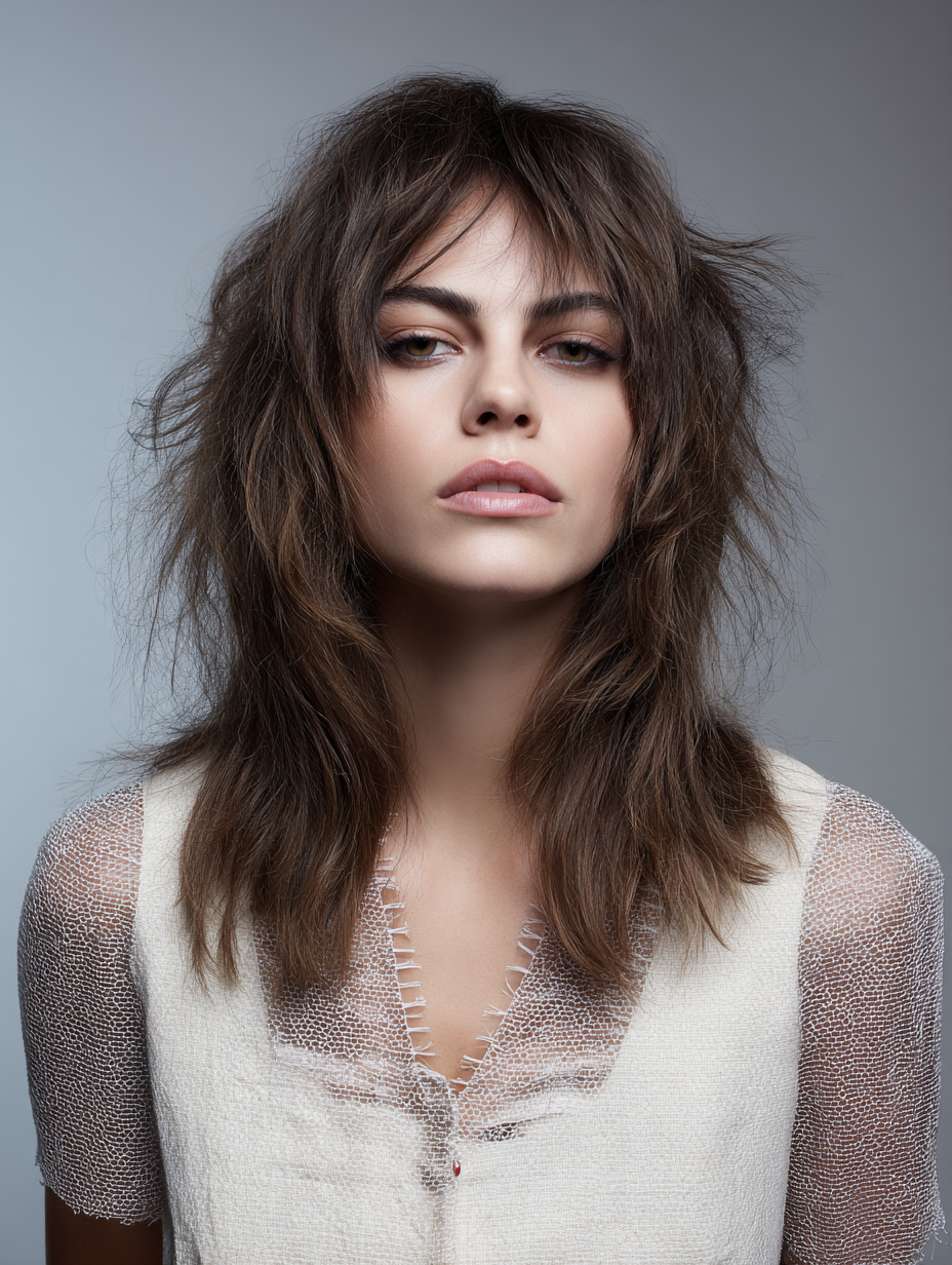 A wolf-inspired shag gives the silhouette more edge, combining volume on top with tapered movement toward the shoulders.