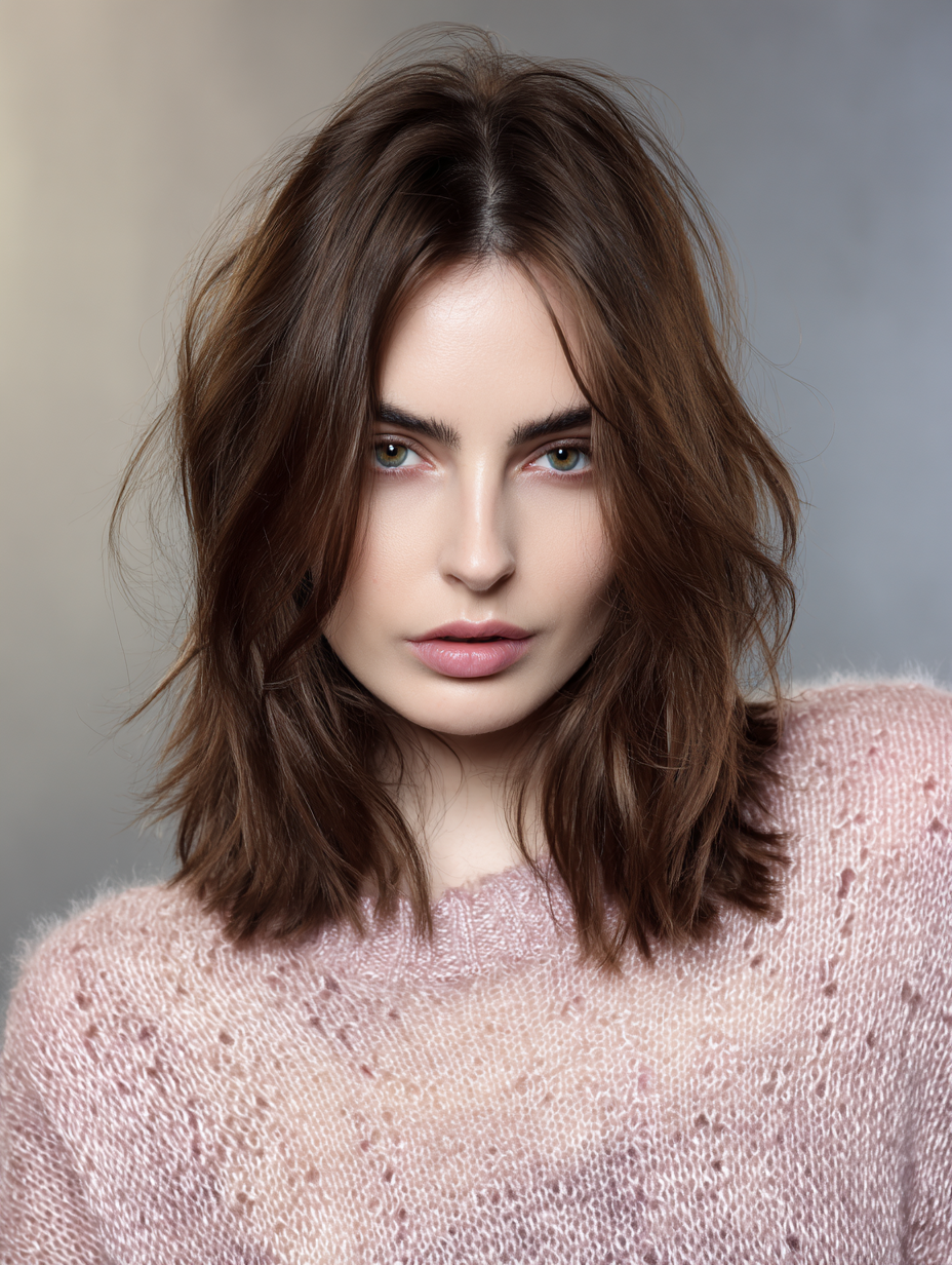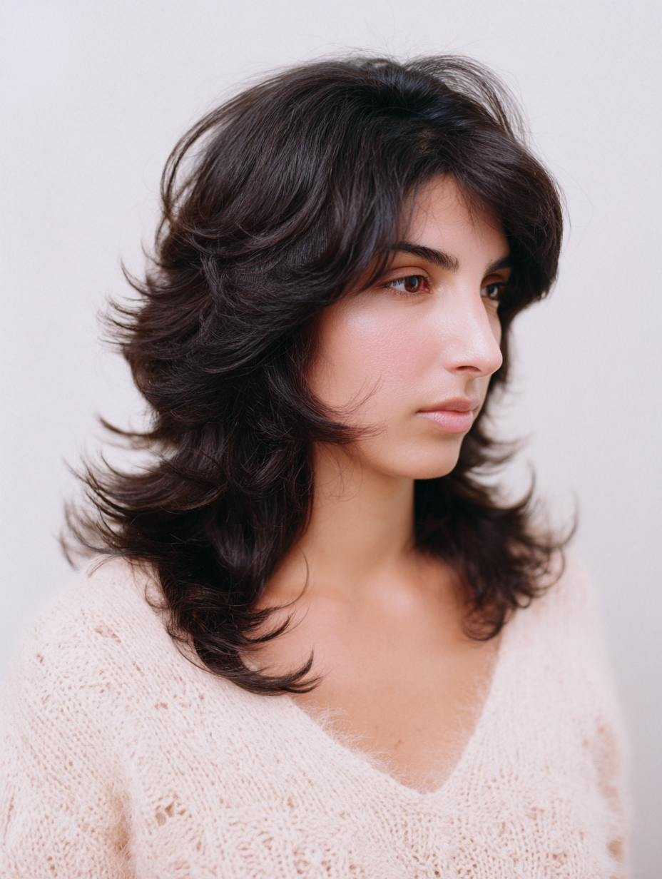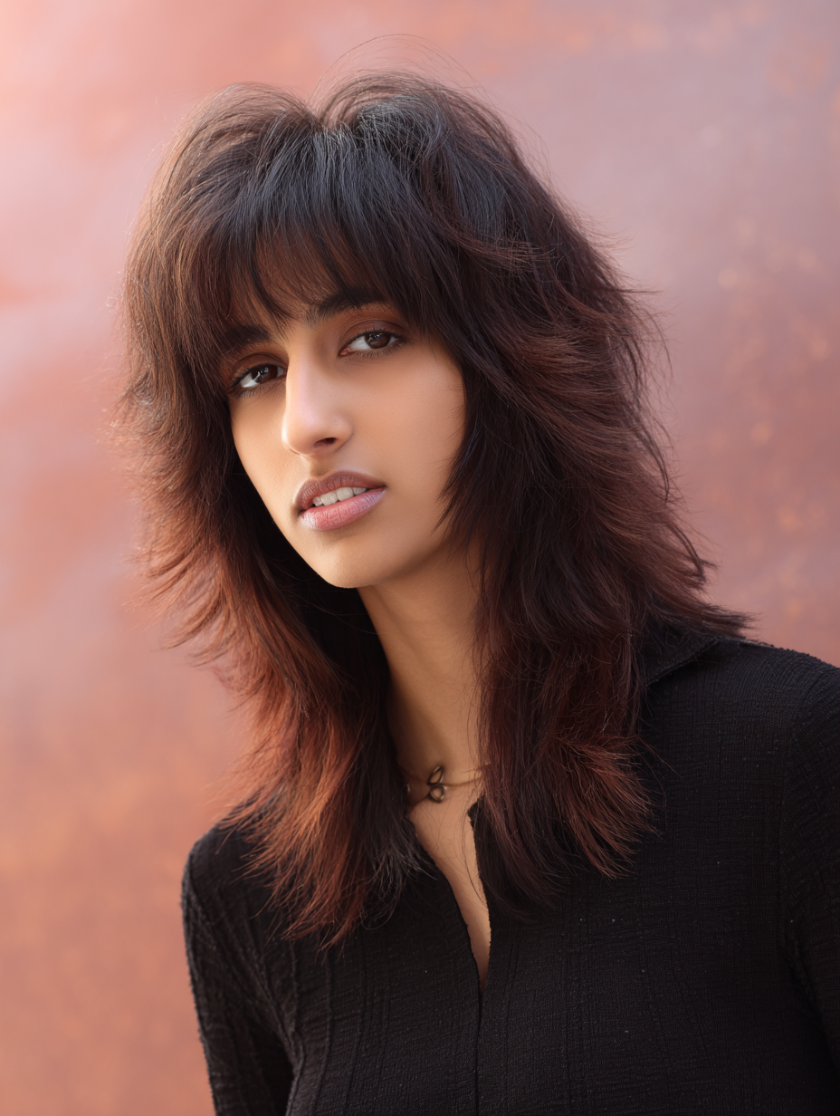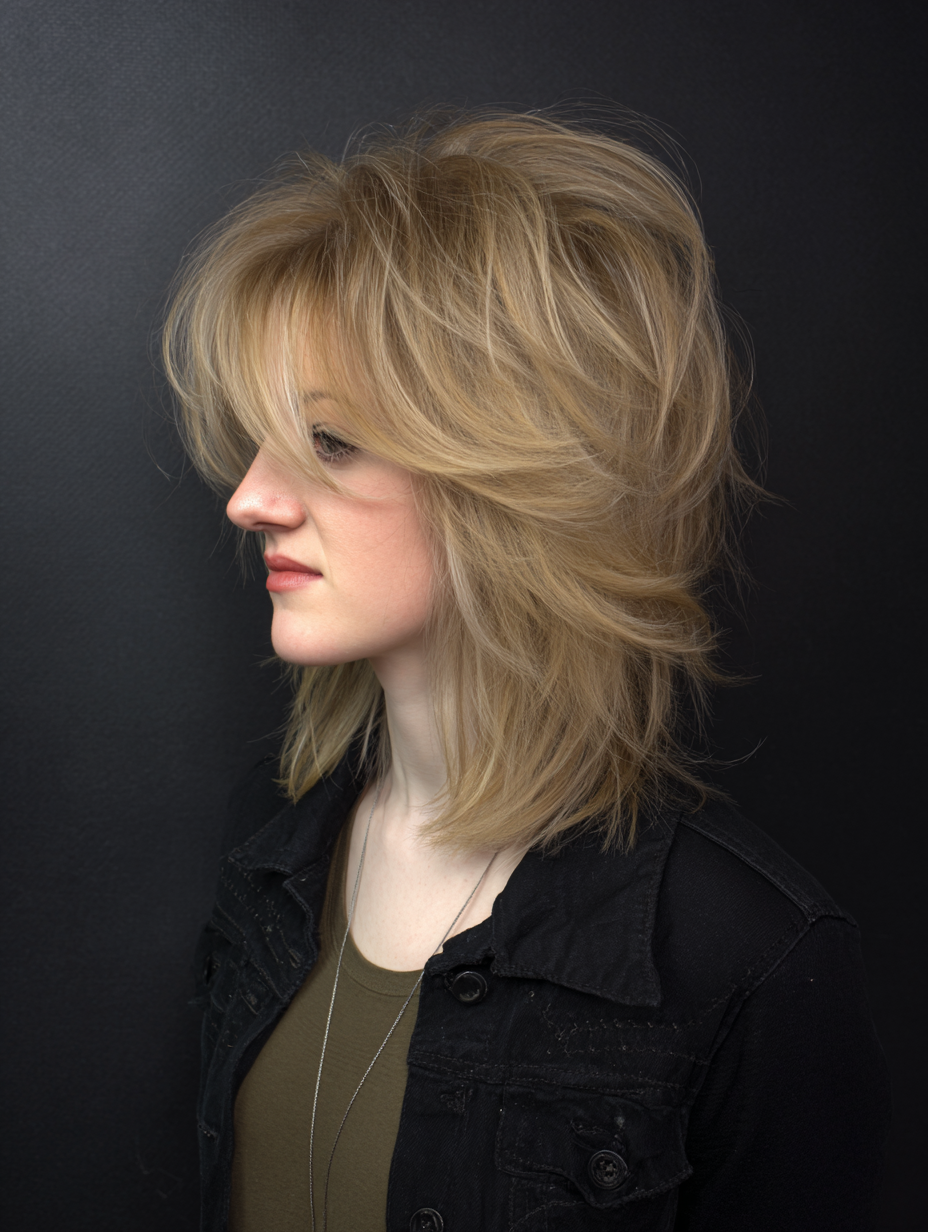 A wolf-inspired shag gives the silhouette more edge, combining volume on top with tapered movement toward the shoulders.