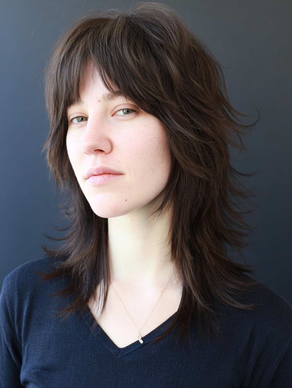 Blunt micro bangs create a stylish contrast against the piecey layers of this shag.