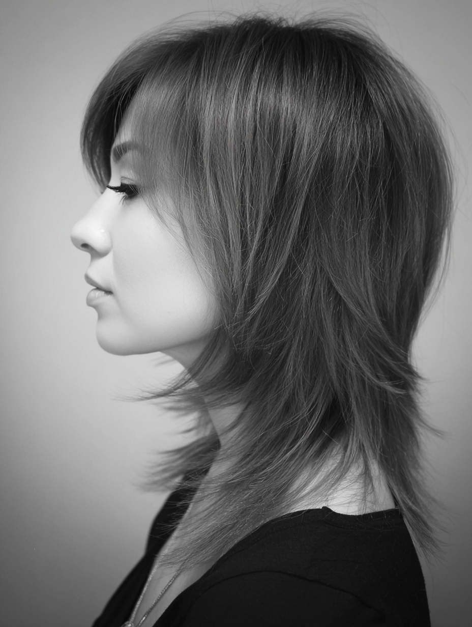 Side-swept bangs add direction and draw attention toward the eyes, giving this shag a graceful touch.