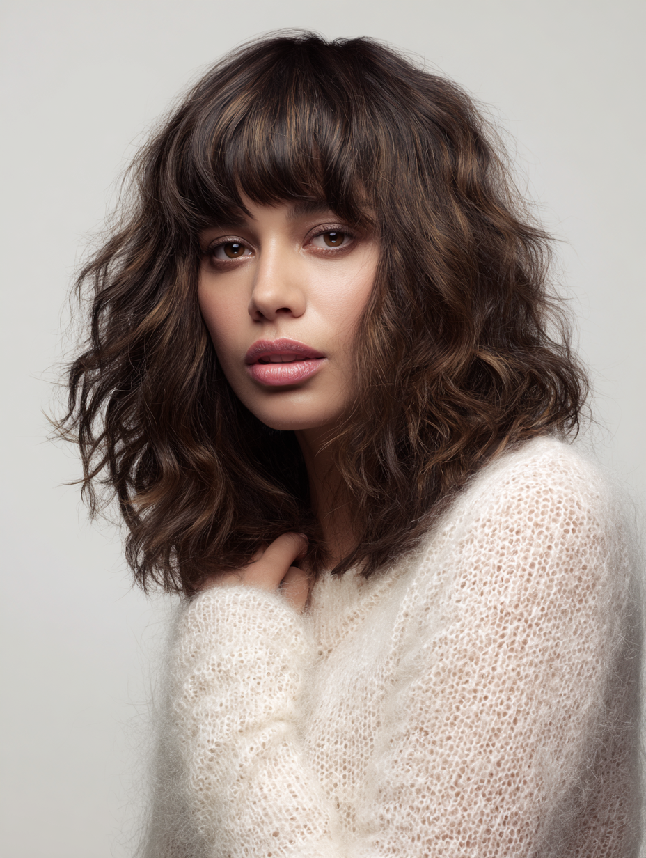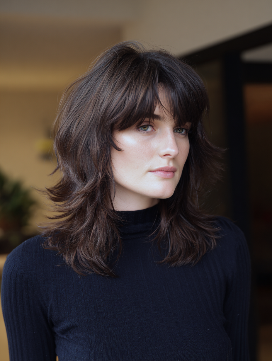 Curtain bangs blend seamlessly into this shag, framing the face while soft layers add dimension throughout.