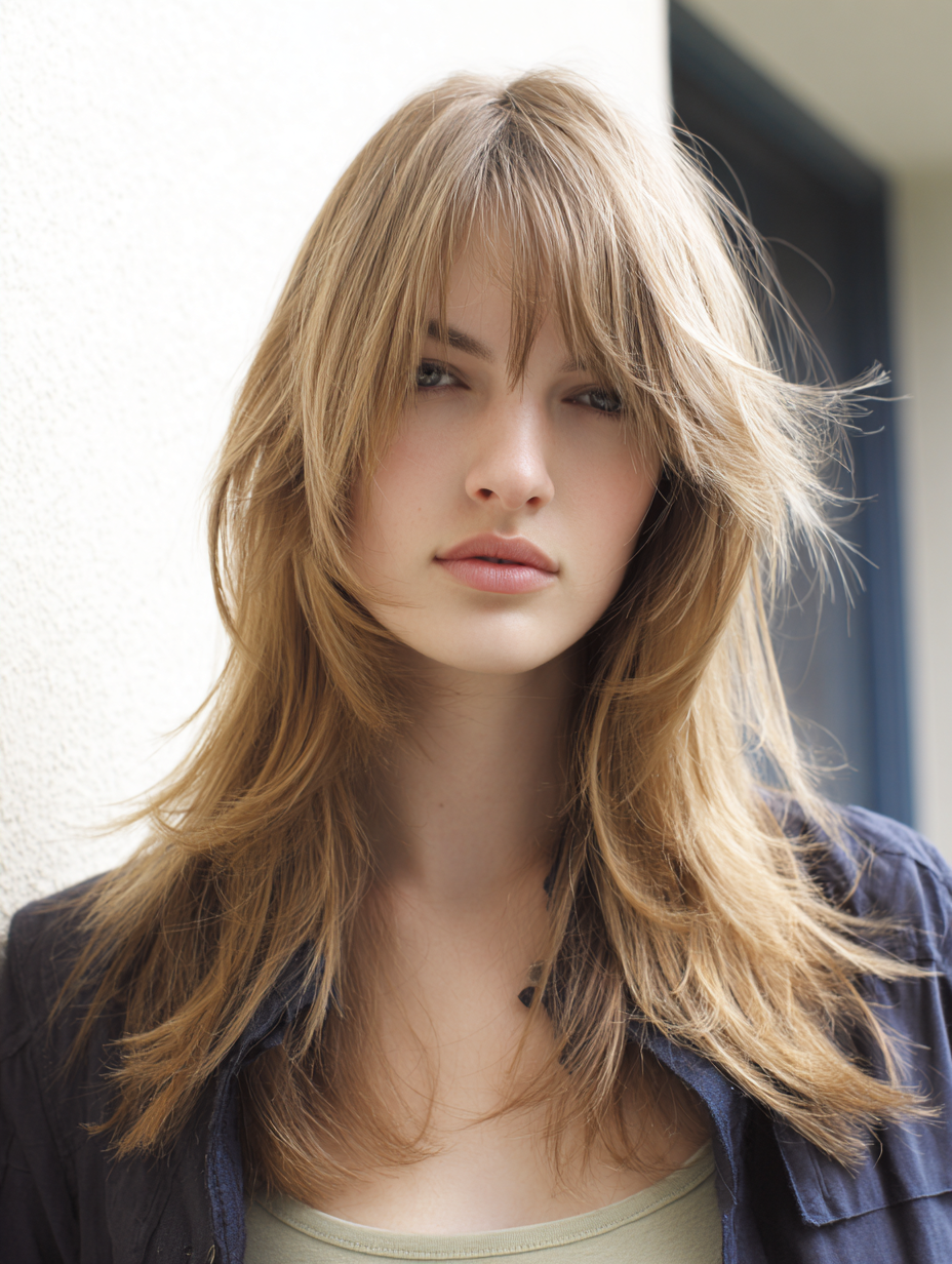 The rest of the haircut stays softly layered, creating a cohesive and balanced shape. This version feels especially flattering for longer face shapes.