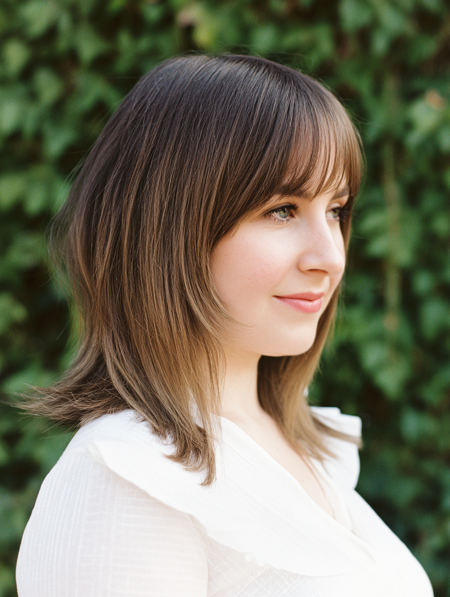 The bangs stay light and airy, blending naturally into layered sides.