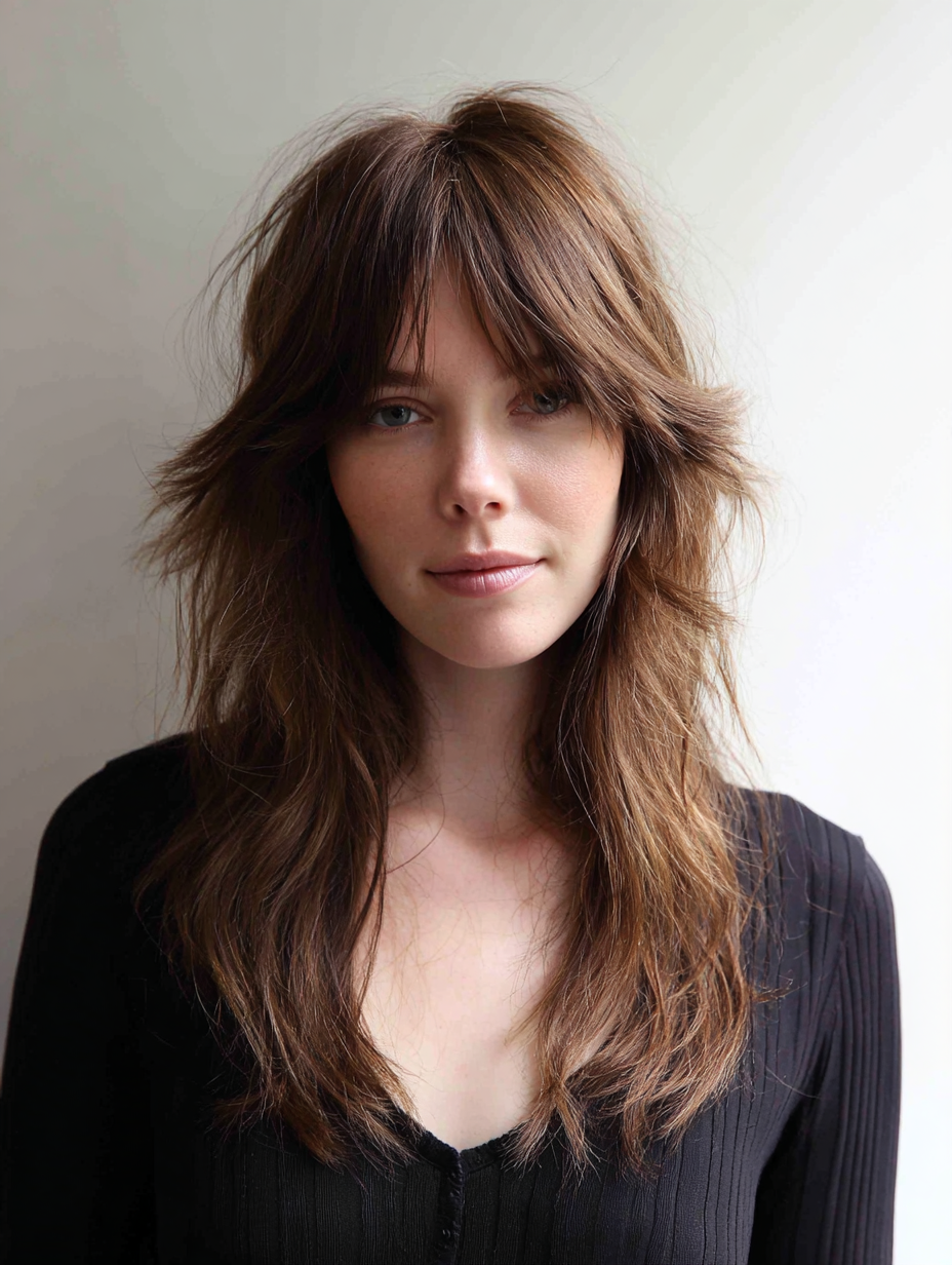 Wispy bangs paired with a medium shag instantly soften a longer face and bring focus toward the eyes.