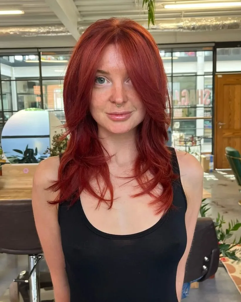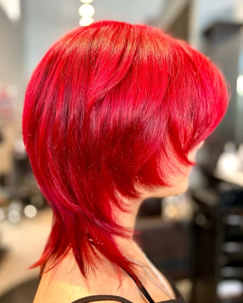 The rich red and cherry tones shimmer under the light, creating depth and dimension with every turn. This cut works best with straight or softly curled textures, making the layers pop with motion. It’s a bold, confident look ideal for those who want color and cut to work together in full harmony.