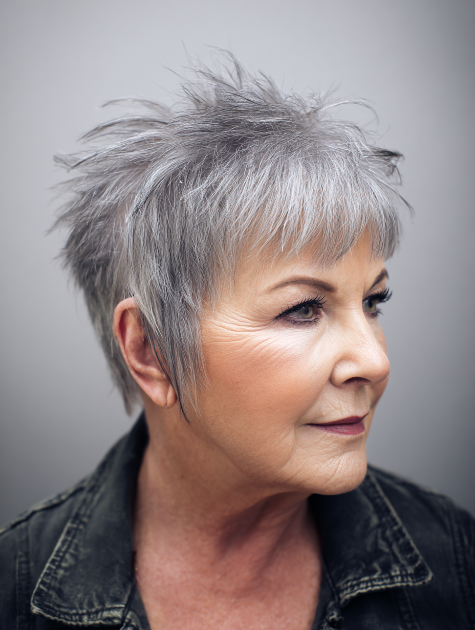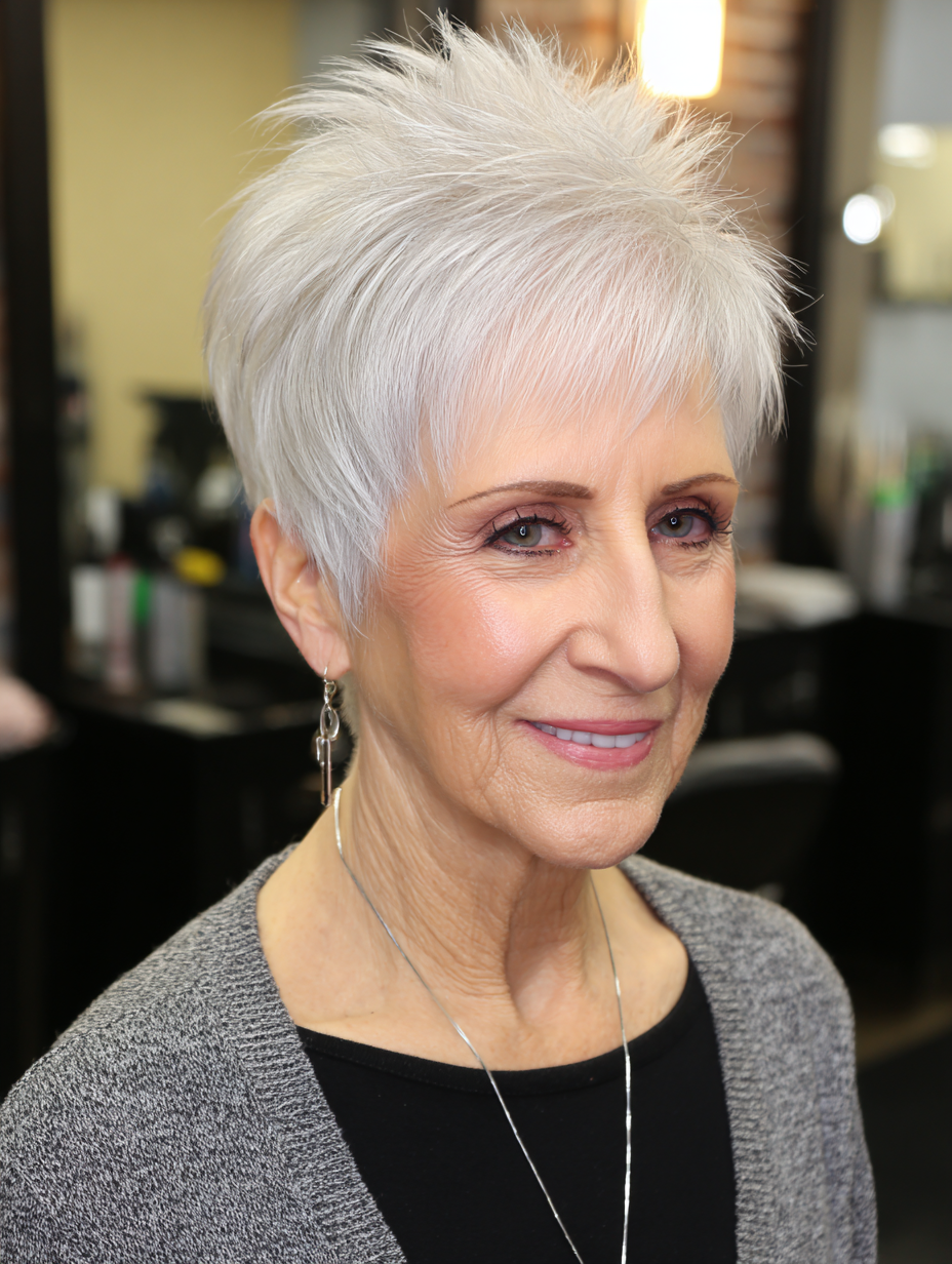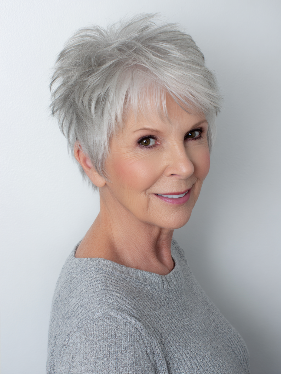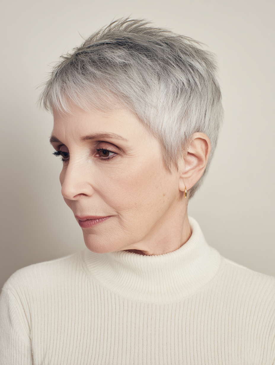 Extra height at the crown gives this pixie a lively shape that brightens mature features. Short tapered sides keep the haircut controlled while the lifted top adds balanced fullness. This approach works especially well for finer hair because the height creates the appearance of thicker strands. A round brush can strengthen the lift, although finger styling also keeps things simple. The overall effect feels fresh, lightweight, and confident without demanding a complicated routine each morning.