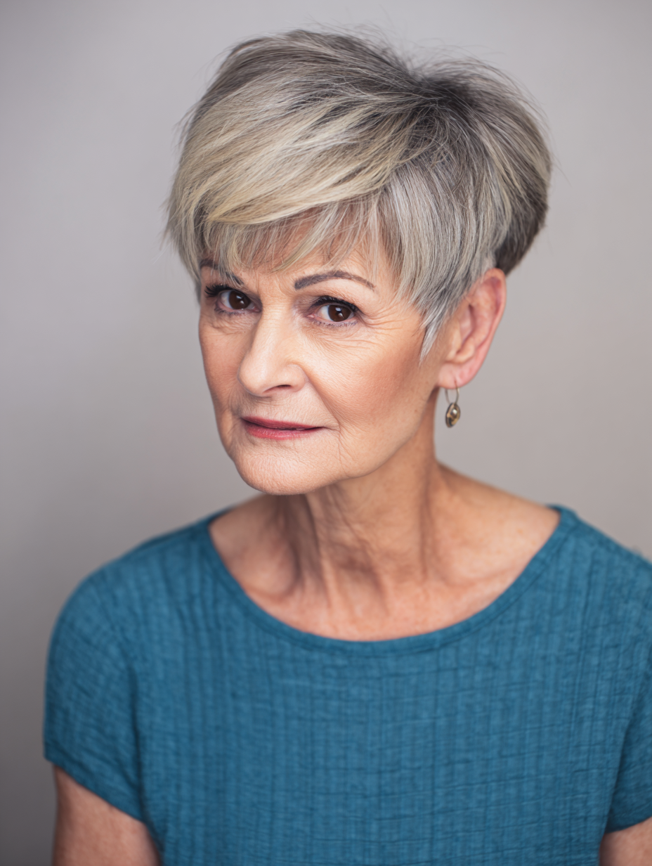 Gentle layering gives this pixie natural movement that feels effortless throughout the day. The crown lifts slightly, adding dimension without creating unnecessary bulk. Short sides keep the silhouette neat, while the longer top encourages soft flow that flatters mature features. Finger styling usually provides enough shape, though a small amount of cream can add subtle definition. This option stays practical for everyday wear and offers a balanced mix of structure and ease.
