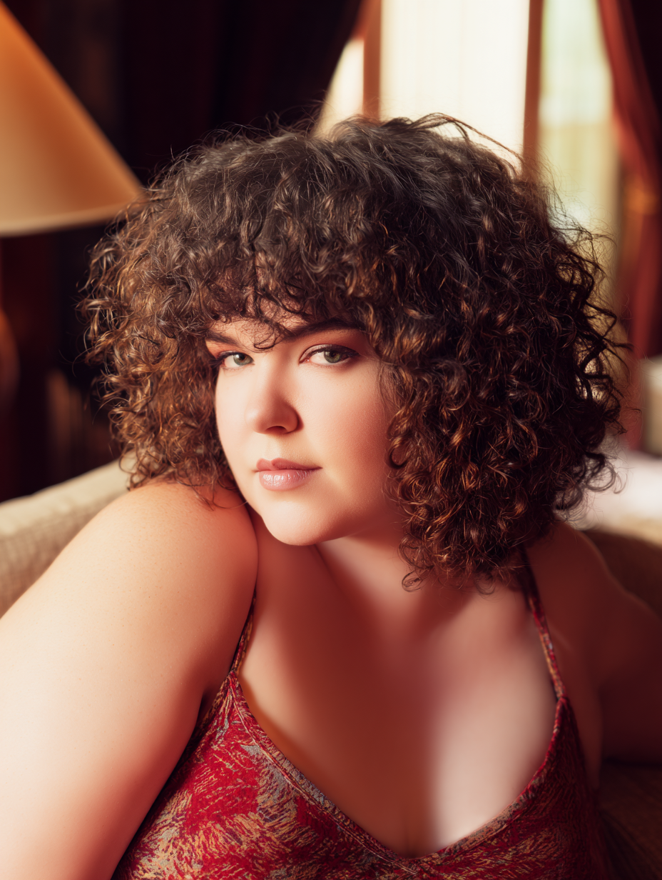 Voluminous curls with long side bangs bring height and movement that complement fuller facial features. The curls sit naturally around the shoulders, creating lift that helps lengthen the face.