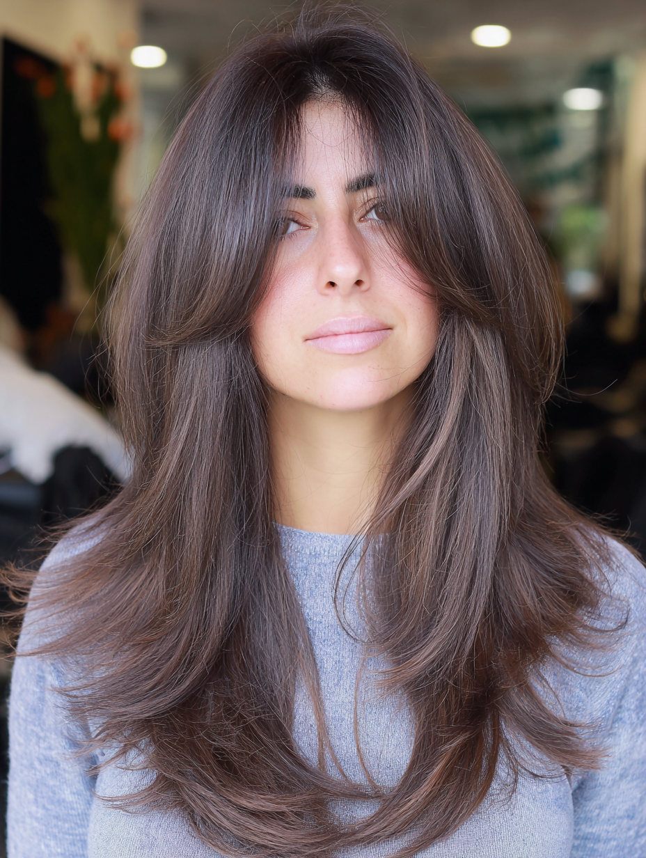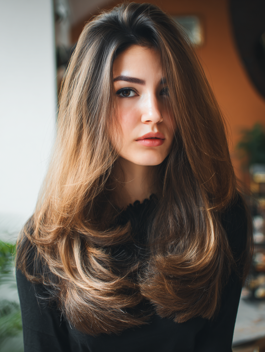 The feathering through the ends prevents the style from looking heavy or dense. A light finishing spray keeps everything airy and touchable.