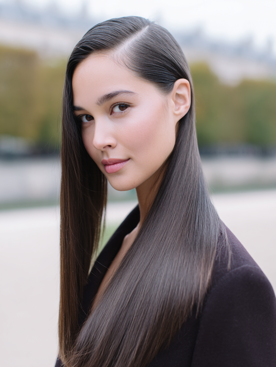 Wearing the hair sleek emphasizes length and clean lines. A shine serum adds polish without weighing strands down.