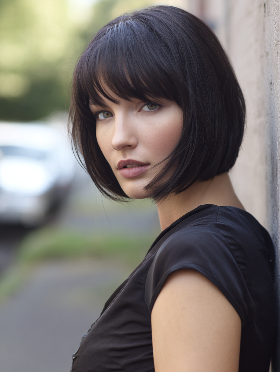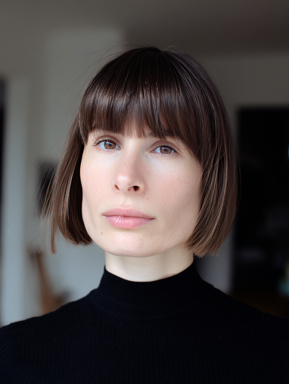 This chin-length bob keeps everything sharp and clean, while blunt bangs frame the face with strong definition.