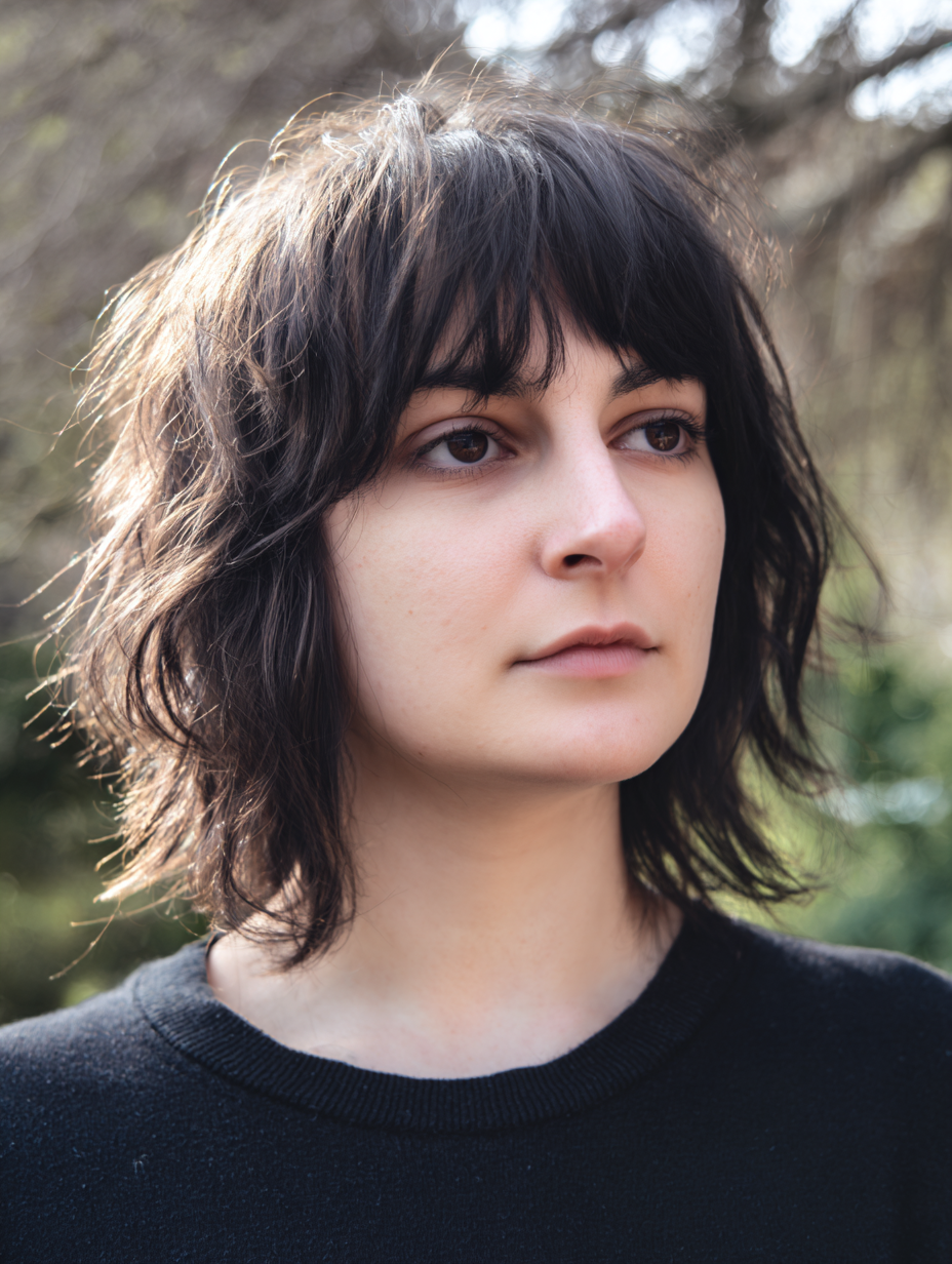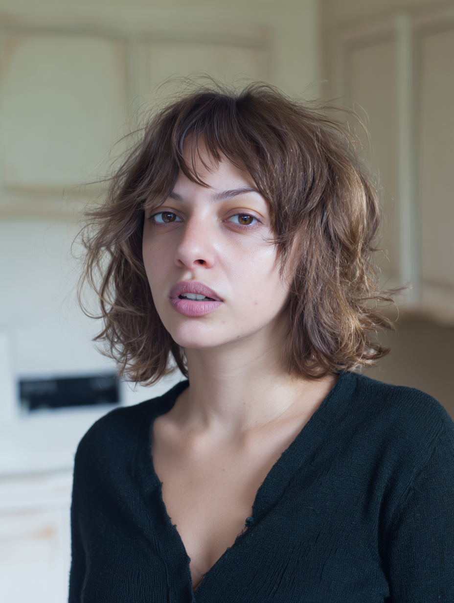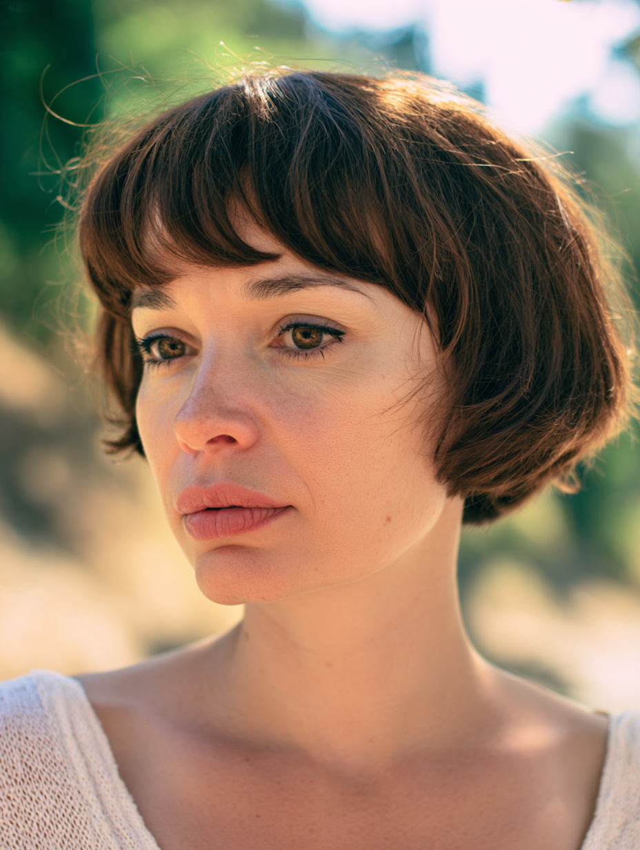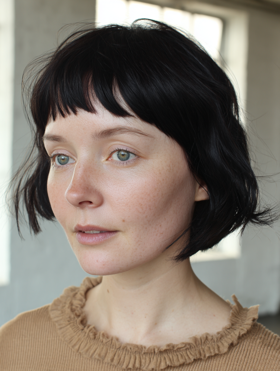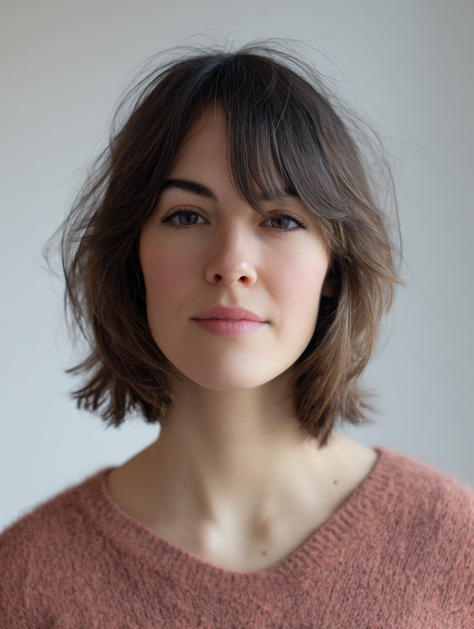 The bangs are slightly uneven, adding character without looking messy.