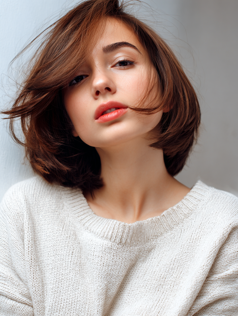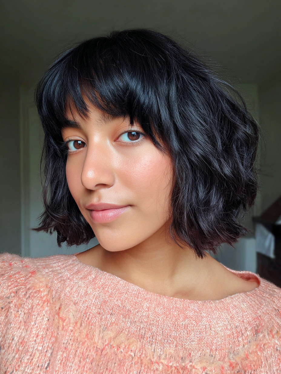 For thick hair, internal layering removes bulk while keeping the shape intact. Wispy or side-swept bangs prevent the front from looking too heavy. Your stylist will likely texturize the ends so the bob sits correctly instead of flaring out.