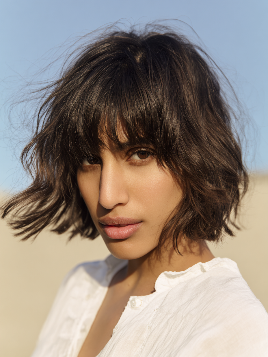 A shaggy bob introduces light layers throughout, giving the hair movement and a slightly undone texture.