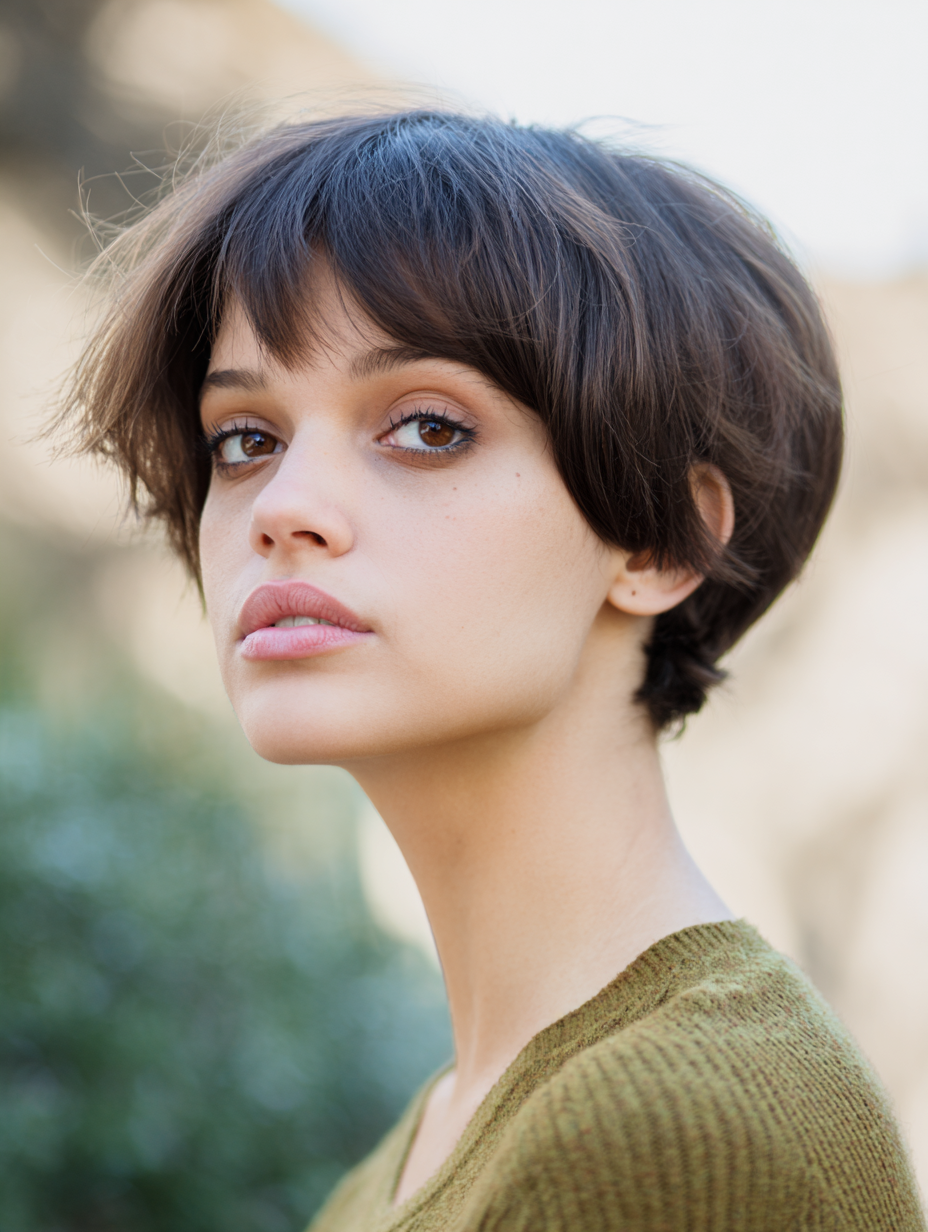 The cut frames the face closely, enhancing natural features without overwhelming them.