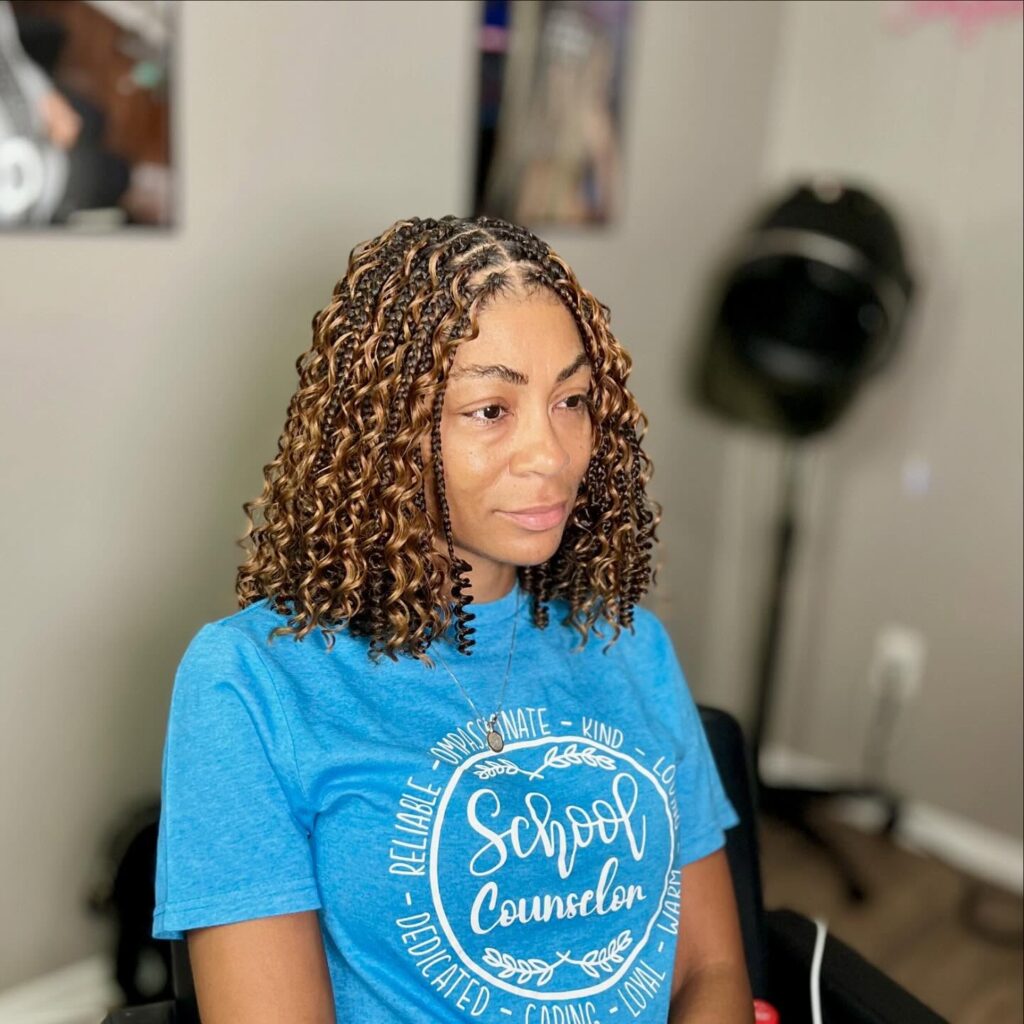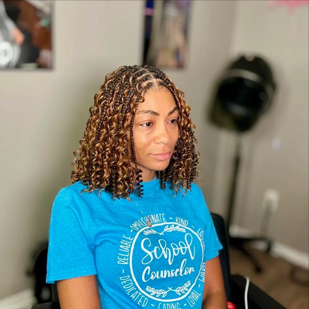 This curly boho box braid bob combines traditional braiding with loose, defined curls for a textured and carefree vibe. The braids are medium-sized and fall into a full, shoulder-grazing bob. Golden brown highlights woven throughout add warmth and depth to the style.