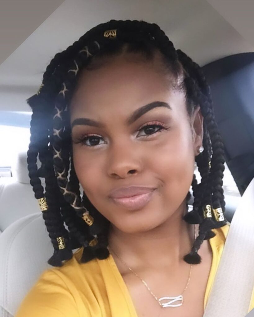 Each braid is finished with a knot at the end, while gold cuffs are spaced throughout for added detail and flair. The style is simple yet eye-catching, offering a protective look that’s perfect for everyday wear or casual outings with a polished twist.
