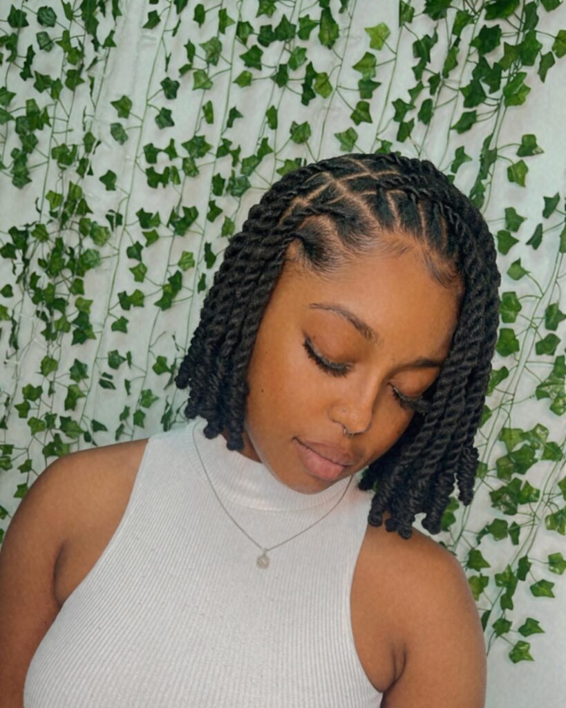 These short twist braids fall gracefully into a chin-length bob, styled with a soft side part for added volume. The twists are uniform and neatly installed, giving a sleek and polished finish.