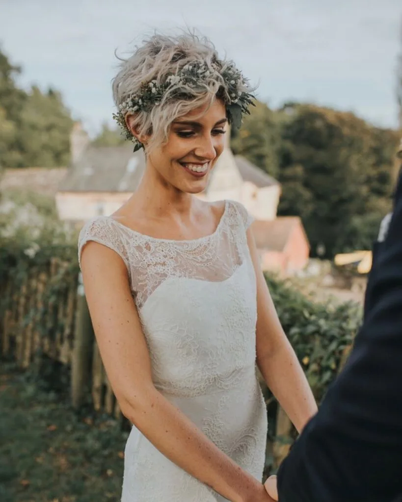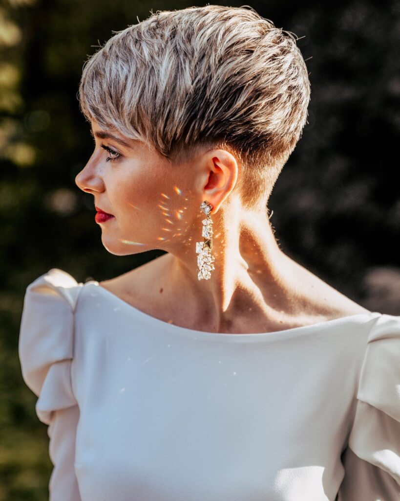 This bridal hairstyle features a soft blonde pixie cut styled with a gentle side-swept fringe for a timeless and feminine look. The cut is closely tapered around the nape and sides, creating clean lines that frame the face with subtle elegance.