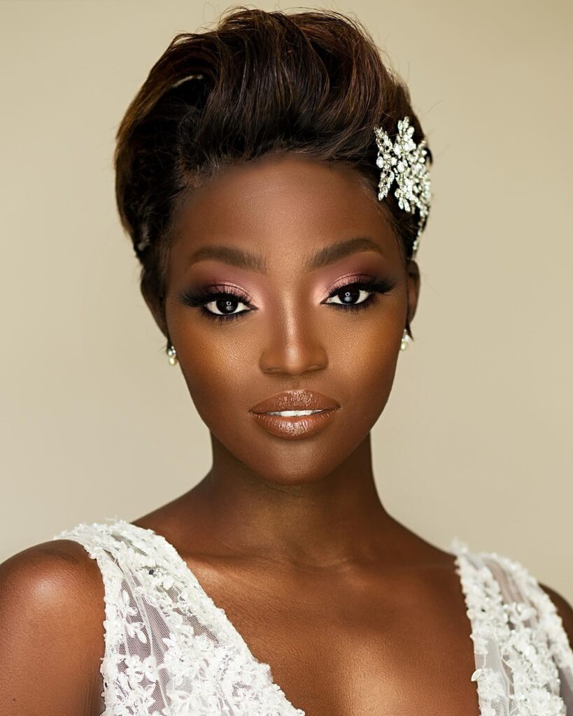 This bridal hairstyle features a neatly shaped teeny weeny afro (TWA) that highlights natural texture with elegant simplicity. The short, rounded silhouette frames the face beautifully, offering a soft and balanced look.