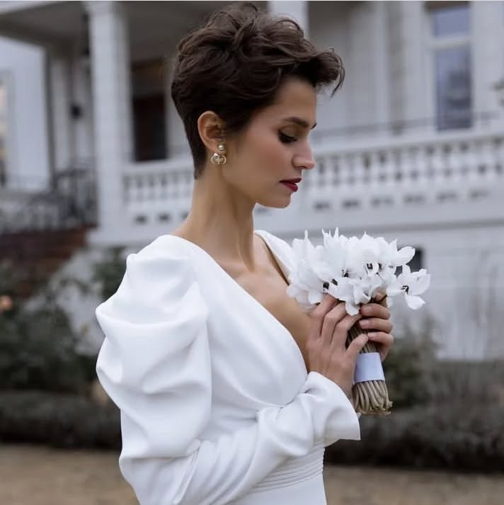 This elegant short bridal hairstyle features a sculpted pixie with lifted volume through the crown and a neatly tapered shape. The top is styled upward and away from the face, creating a bold and graceful silhouette.