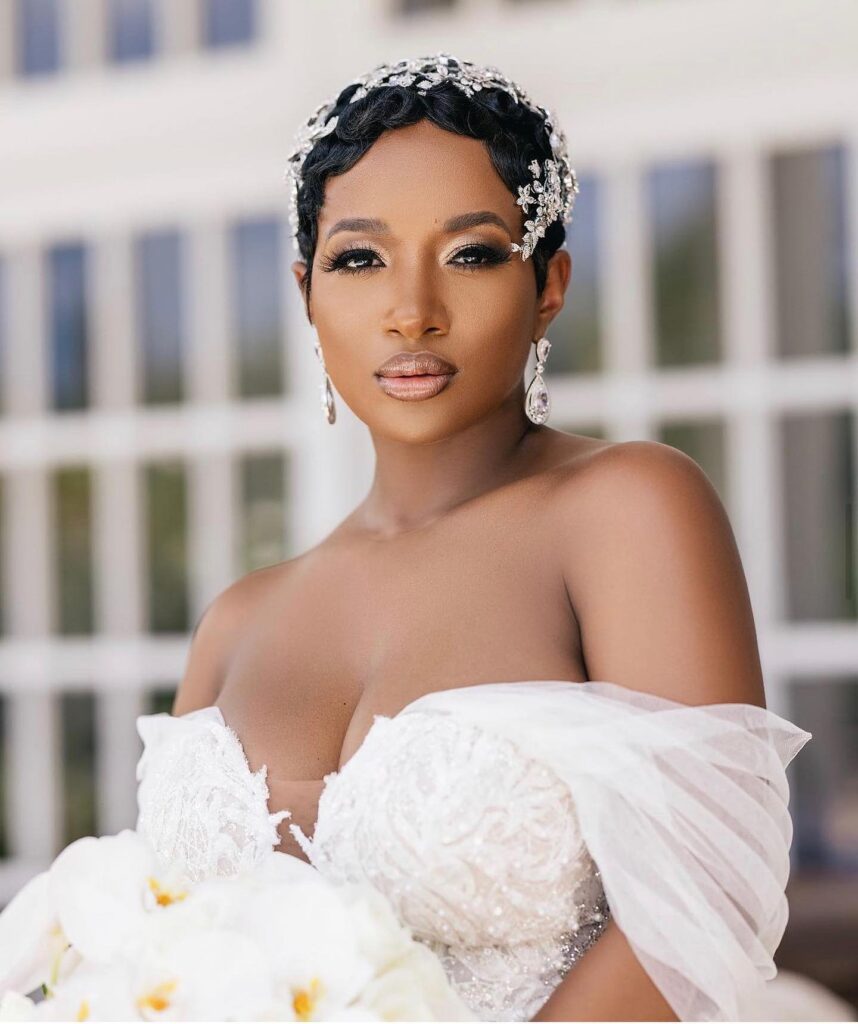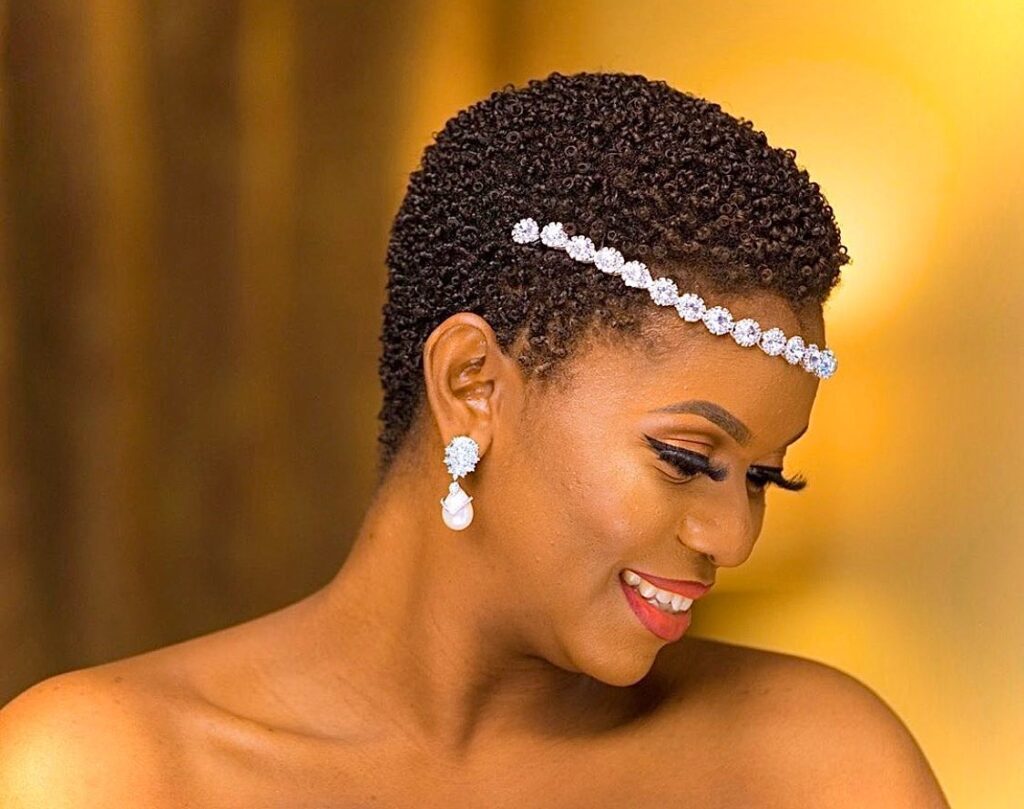 This bridal hairstyle features a neatly shaped teeny weeny afro (TWA) that highlights natural texture with elegant simplicity. The short, rounded silhouette frames the face beautifully, offering a soft and balanced look.