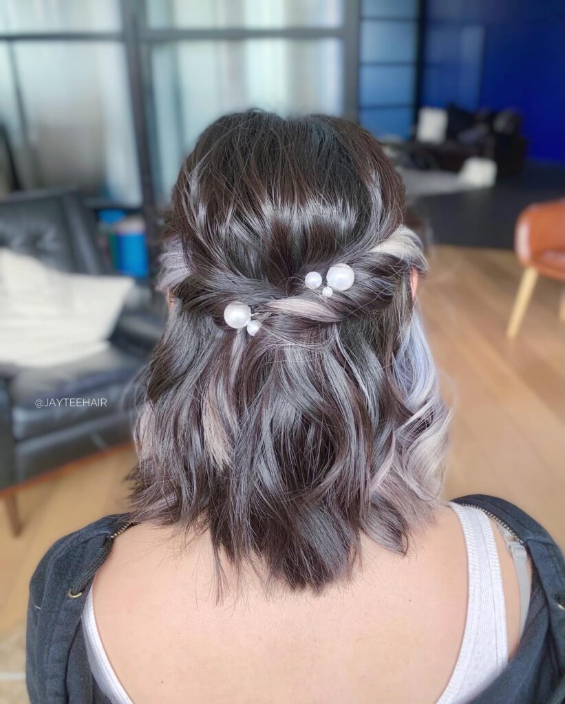 This short bridal hairstyle features a softly waved texture with a gentle half-up style that adds dimension and elegance. The top section is twisted and pinned back, creating a flattering shape while allowing the waves to fall naturally.