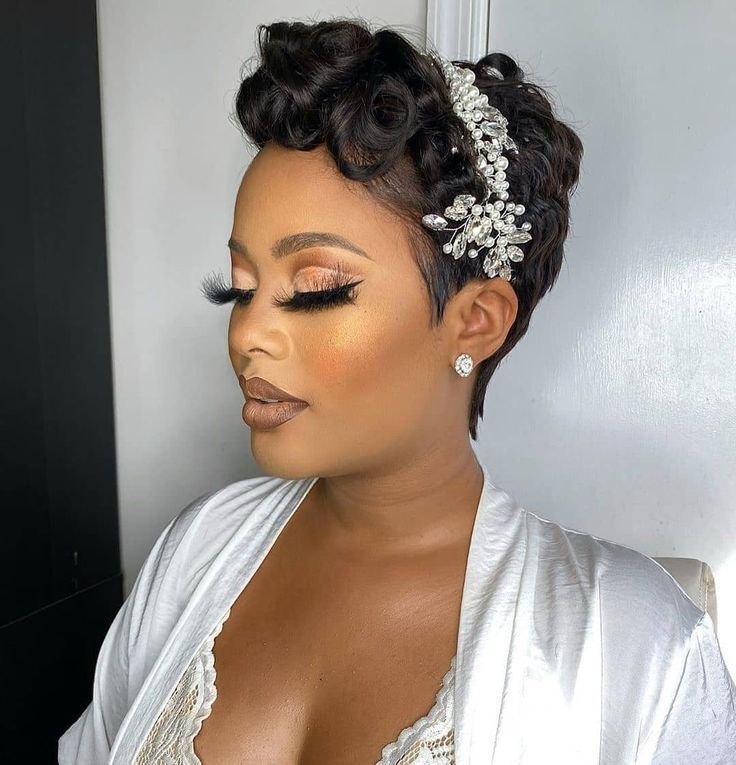 This short bridal hairstyle features a glossy pixie cut styled in smooth, sculpted waves for a refined and graceful finish. The hair hugs the head closely, showcasing its natural texture while keeping the look structured and elegant.