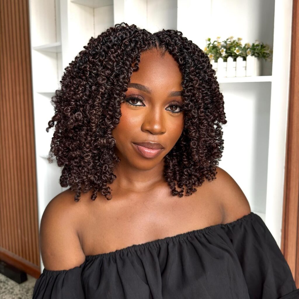 Each twist is separated and fluffed for a fuller, more natural texture. The shoulder-length cut enhances volume while keeping it light and manageable. This style is perfect for those seeking a soft, carefree look that blends elegance with everyday wear. It’s bold, beautiful, and radiates confidence effortlessly.