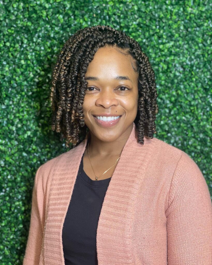 This shoulder-length crochet twist style showcases tightly coiled twists with a beautifully defined curl pattern. The twists fall evenly on both sides of a clean middle part, creating a full and balanced look.