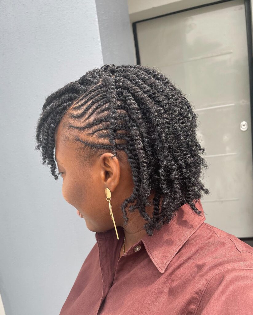 This short crochet twist hairstyle features a neat side part with well-defined twists and sleek cornrow detailing on one side. The twists fall just above the shoulder, giving a bouncy and light shape.