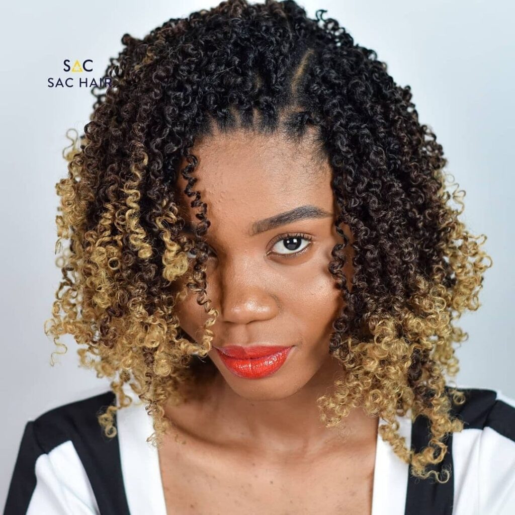 The contrast between the dark roots and light ends adds brightness and edge to the overall look. With a soft shoulder-length cut, it balances manageability with a standout color effect. It’s a stylish protective style that blends texture, vibrancy, and personality in one chic, low-maintenance package.