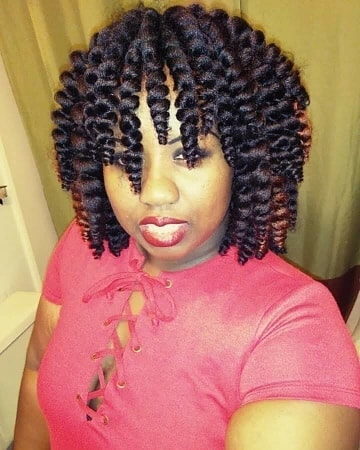 This creative crochet twist hairstyle showcases a curly mohawk style with the sides neatly slicked and secured. The voluminous twists form a curly crest down the center, adding height and drama to the look.
