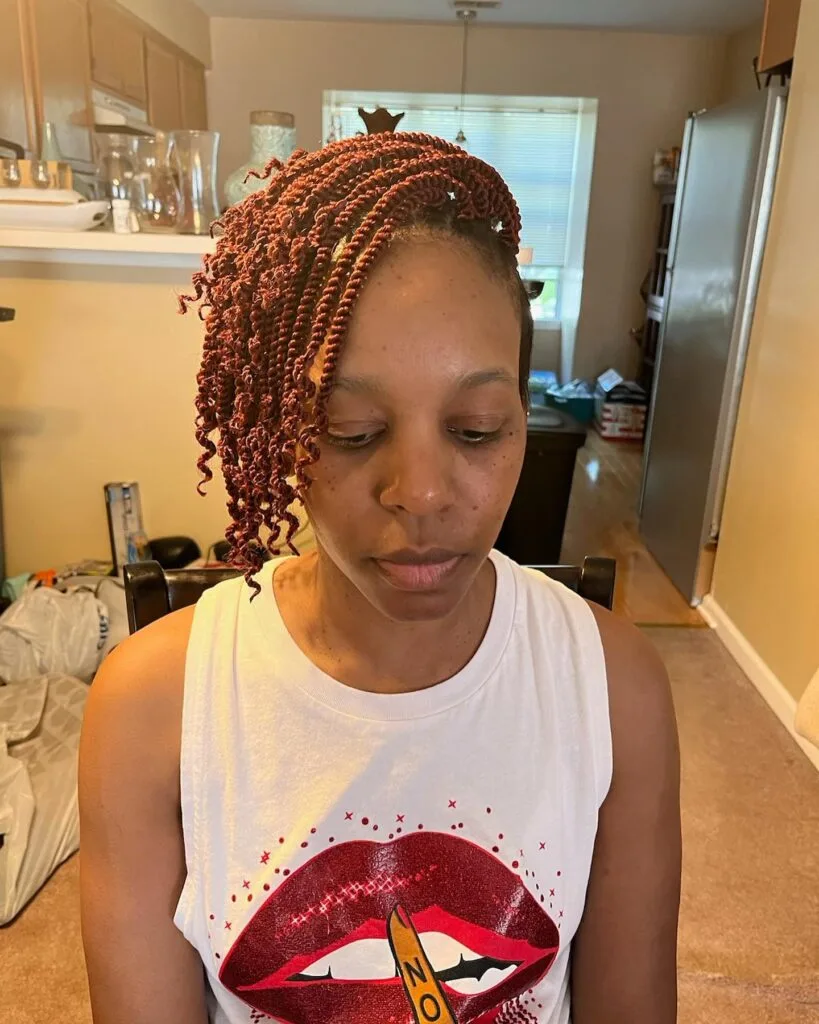 Each twist is separated and fluffed for a fuller, more natural texture. The shoulder-length cut enhances volume while keeping it light and manageable. This style is perfect for those seeking a soft, carefree look that blends elegance with everyday wear. It’s bold, beautiful, and radiates confidence effortlessly.