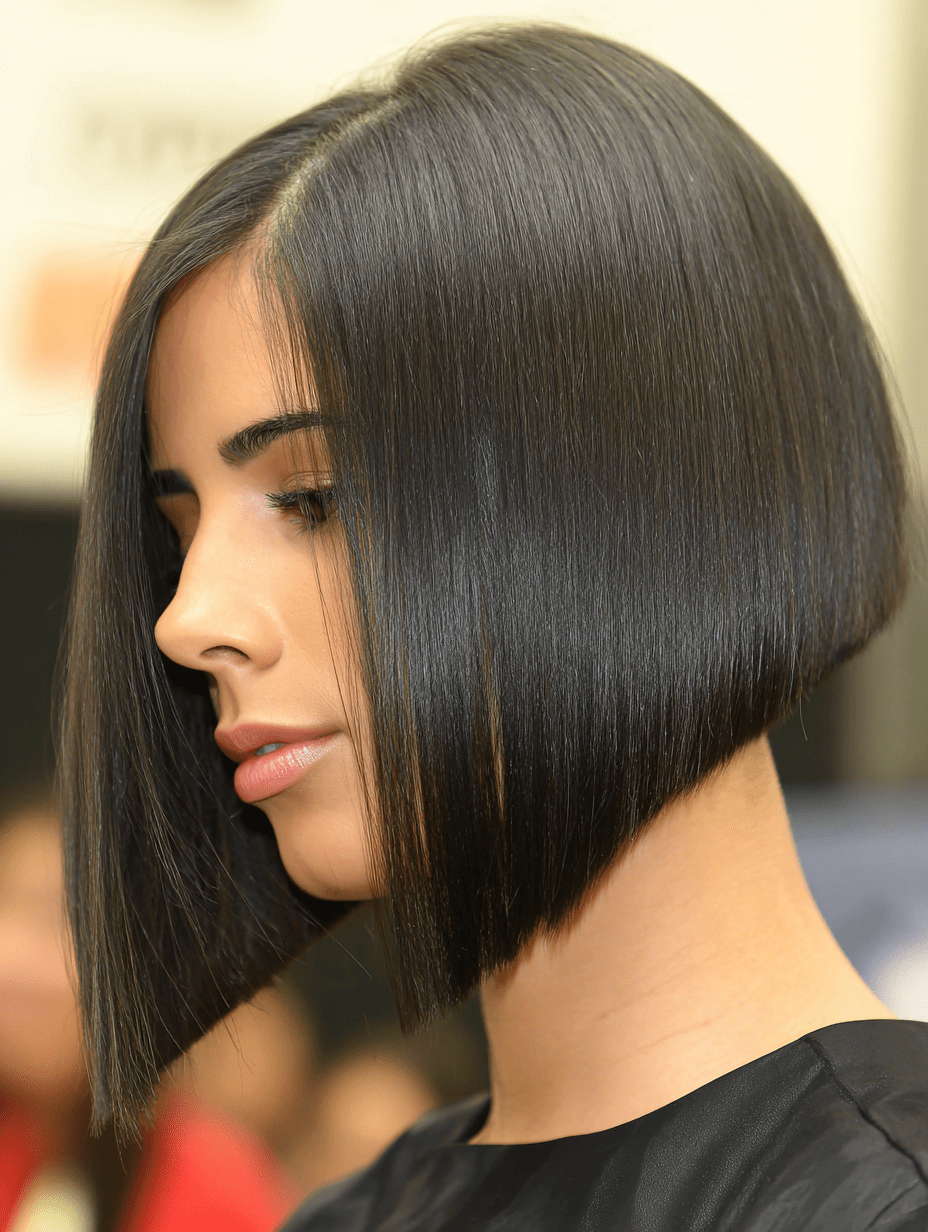 A short A line bob creates a clean, angled shape that looks especially sharp on straight hair.
