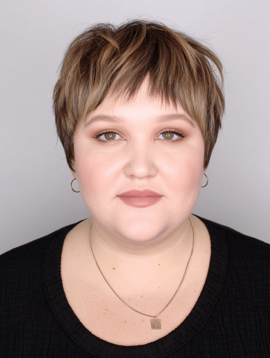 Round faces benefit from short haircuts that add vertical length. Long pixies, asymmetrical bobs, and cuts with lift at the crown help avoid a boxed look.