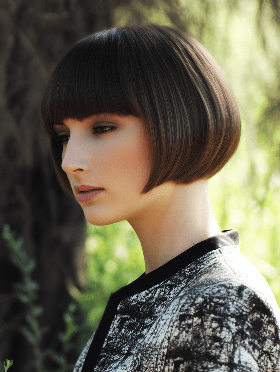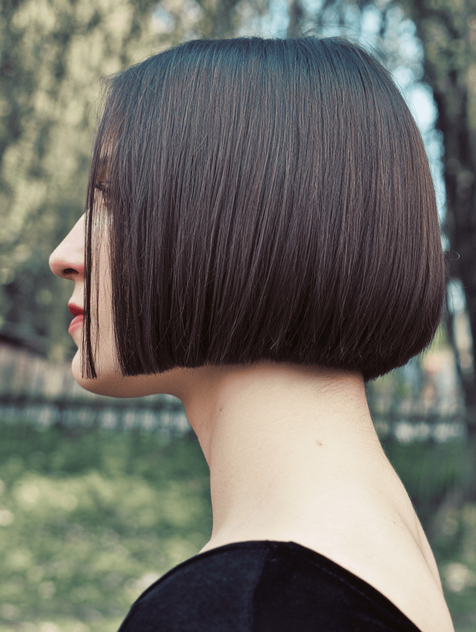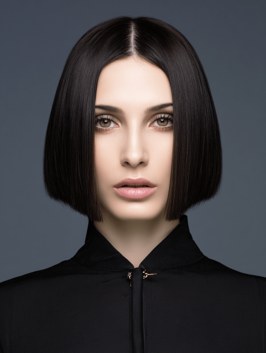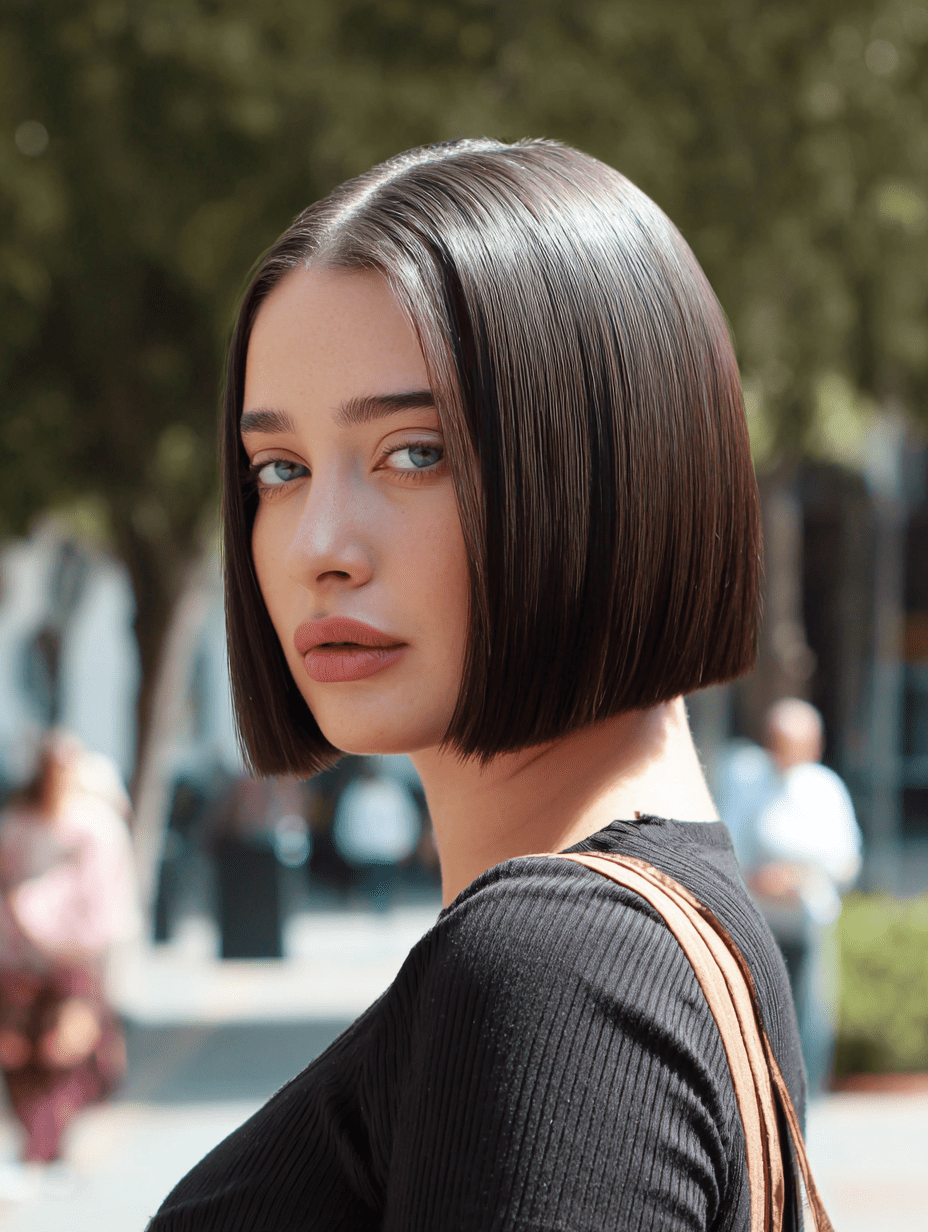 The polished micro bob sits just above the jawline, giving straight hair a crisp, modern finish.