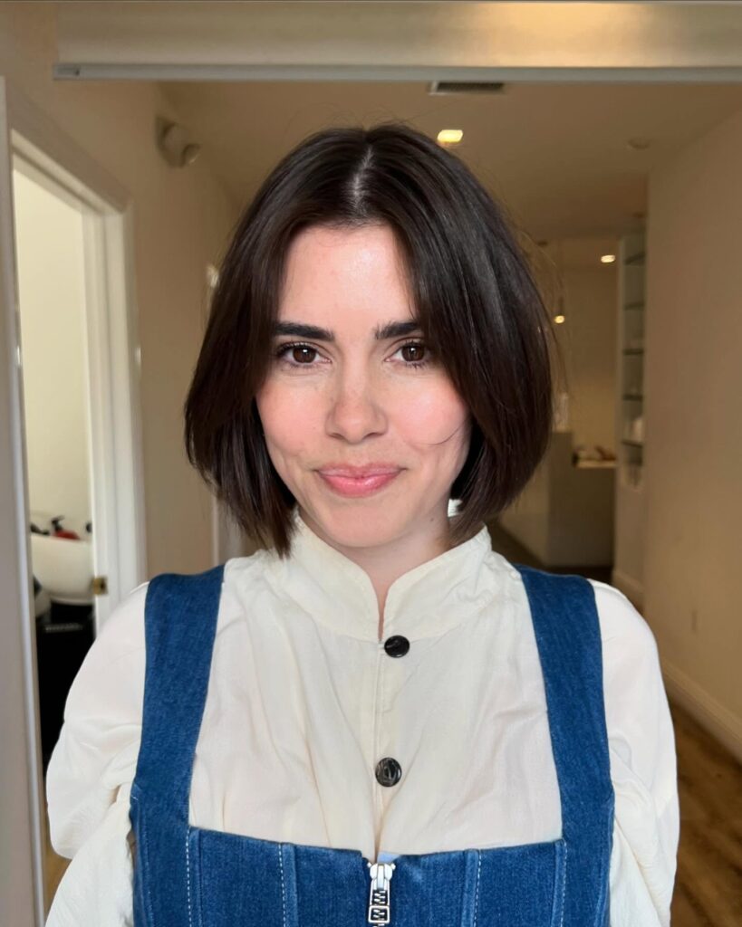 This sleek short bob perfectly complements oval faces by framing the jawline with soft, balanced layers. The slightly inward ends create a polished look, while the middle part enhances symmetry and natural face shape.