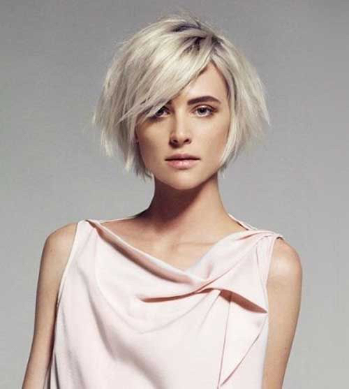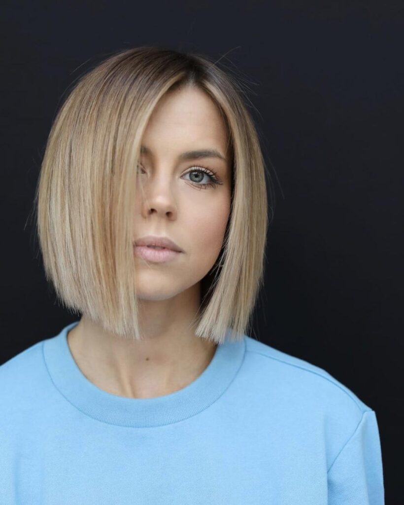 Its side part introduces subtle asymmetry, drawing attention to the eyes and cheekbones. This hairstyle works beautifully with platinum or lighter blonde shades, which enhance its sleek and polished appeal.