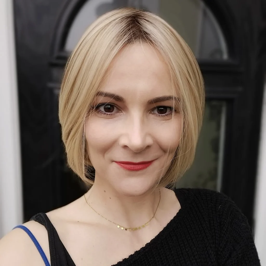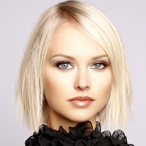 This straight blonde bob is a chic and timeless style that perfectly suits oval faces with its balanced shape. The slightly textured layers keep it from looking too blunt, adding light movement and softness.