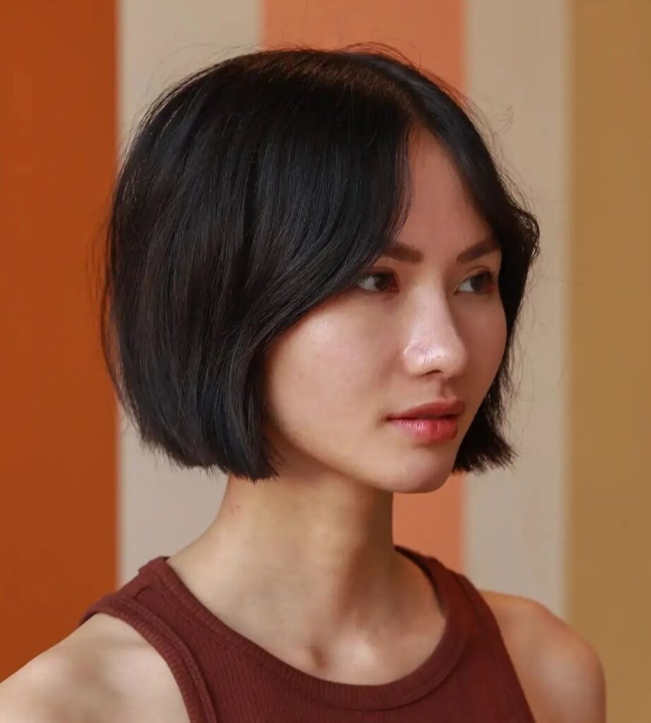 Its sleek texture emphasizes the geometric shape, making it ideal for straight hair types. To enhance the look, a side part adds softness while still keeping the bold, chic appearance intact.