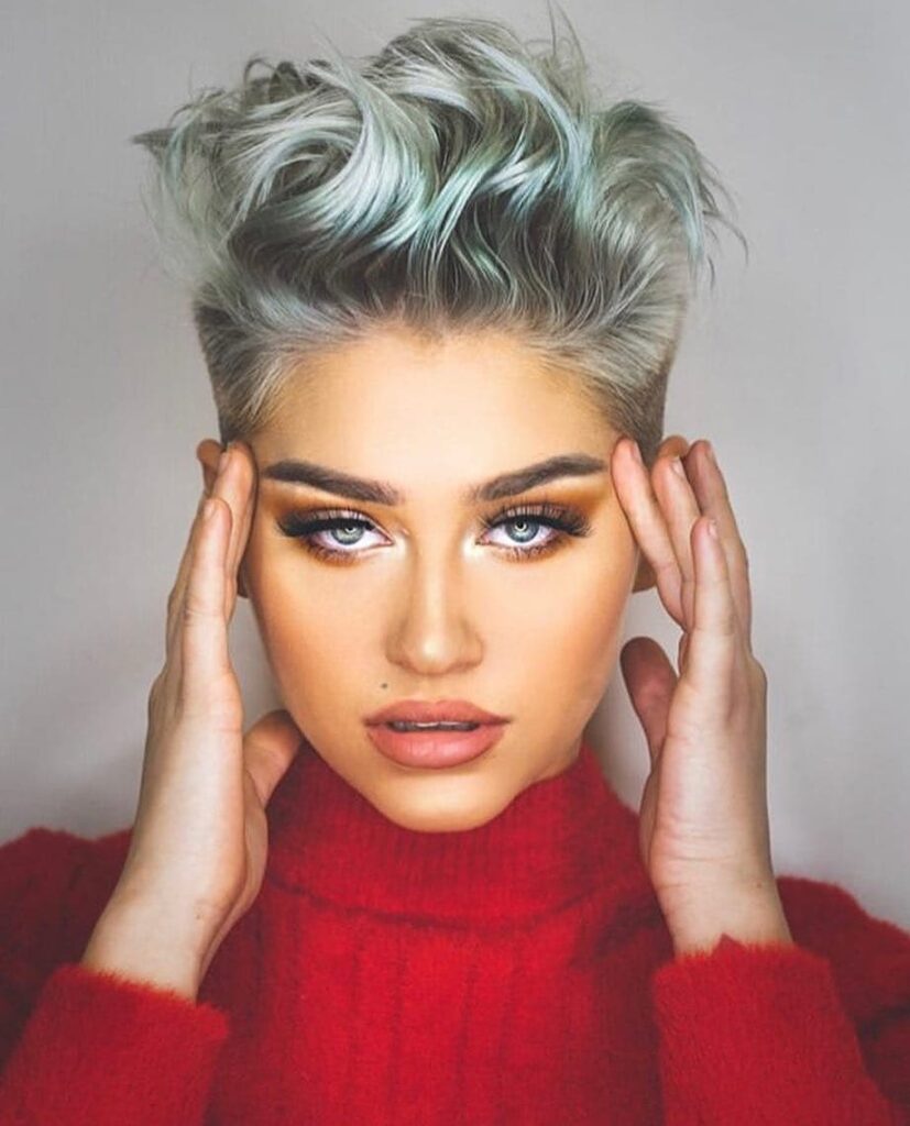 Its lifted crown creates height, elongating the face slightly and giving the cut a bold, modern edge. The icy tones of the hair color enhance the style’s striking appeal, making it a statement look.