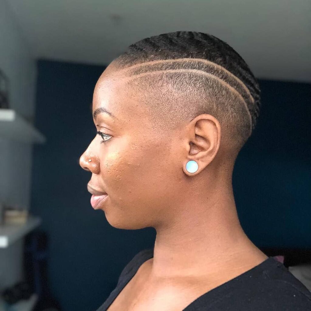 This bold short hairstyle features a clean buzz cut paired with sharply defined curved parting lines on the sides. The top is styled into uniform short twists or waves, offering subtle texture and contrast against the shaved sections.