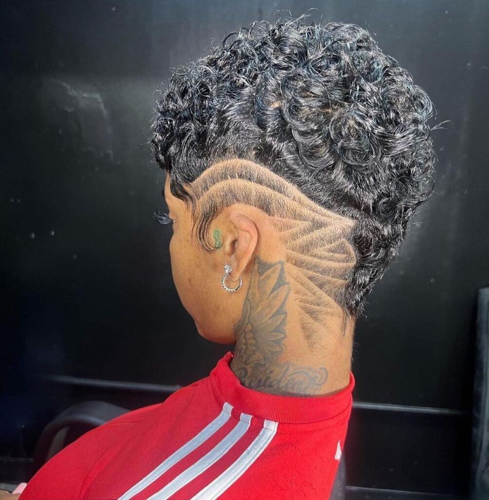This bold short hairstyle features defined natural curls on top with a clean, tapered fade around the sides. The standout detail is the intricate razor design shaved into the fade, adding a modern and creative flair.