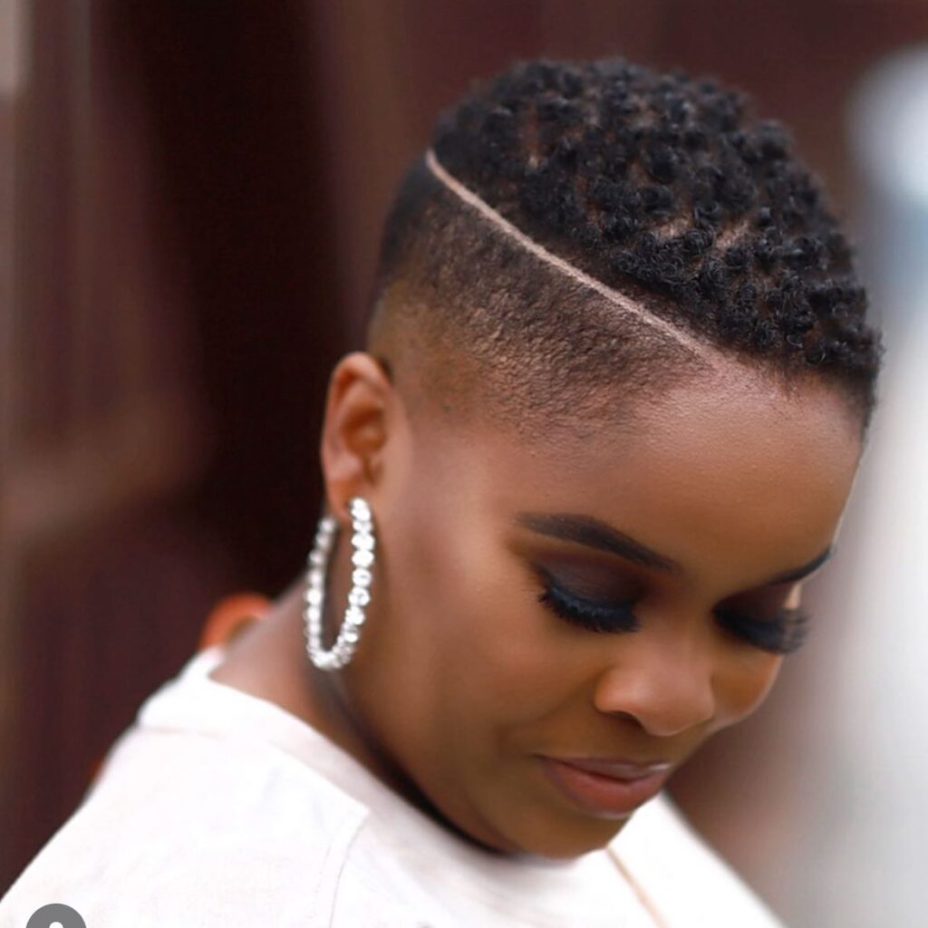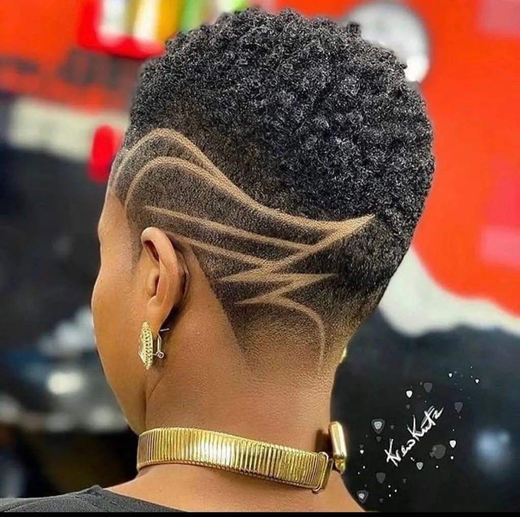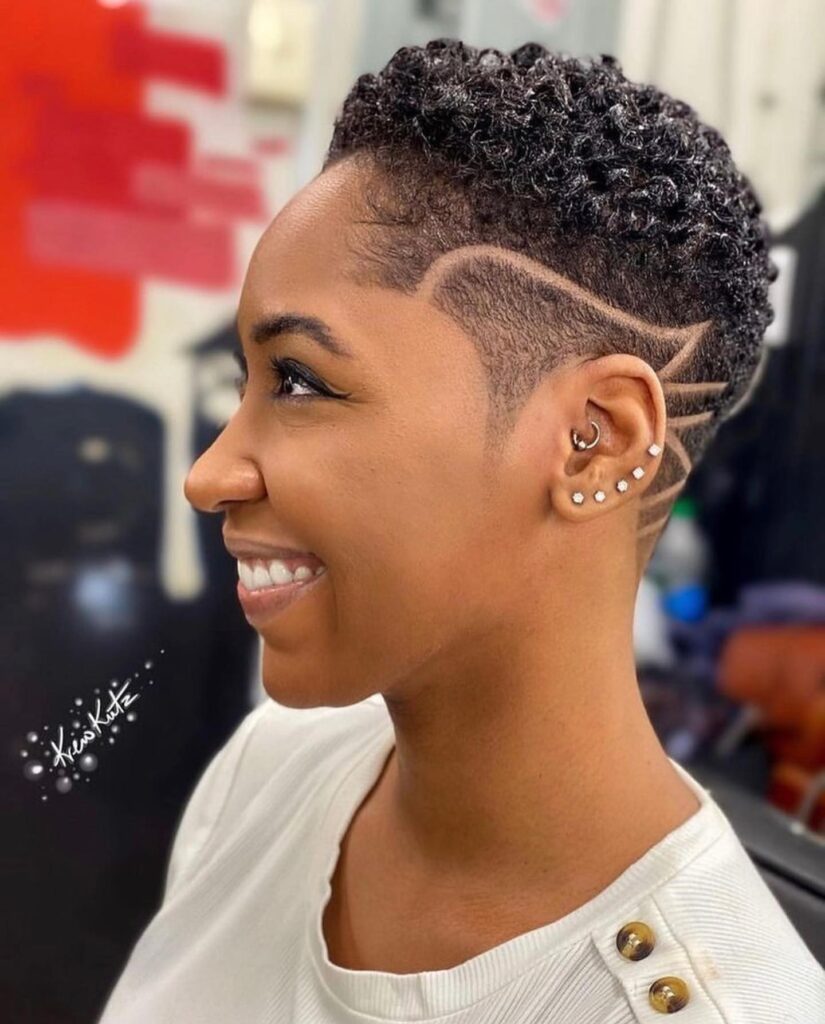 This hairstyle features short, coiled curls shaped into a flattering tapered cut that enhances the natural texture. The sides and back are faded smoothly, creating a clean canvas for the bold razor design.