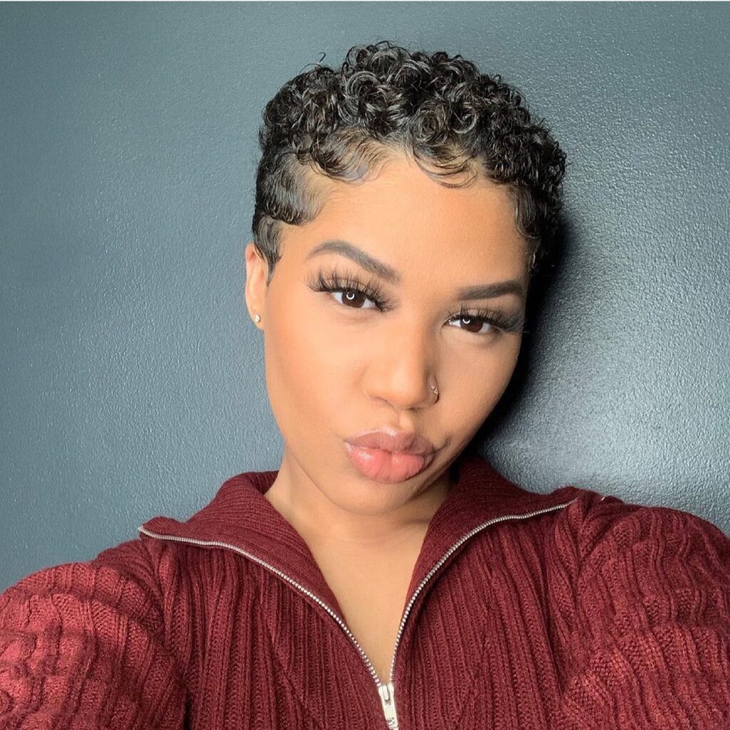 This short hairstyle features neatly defined curls cropped close to the scalp for a clean, fresh finish. The tight curls are styled with precision, giving the overall look a soft, sculpted shape.
