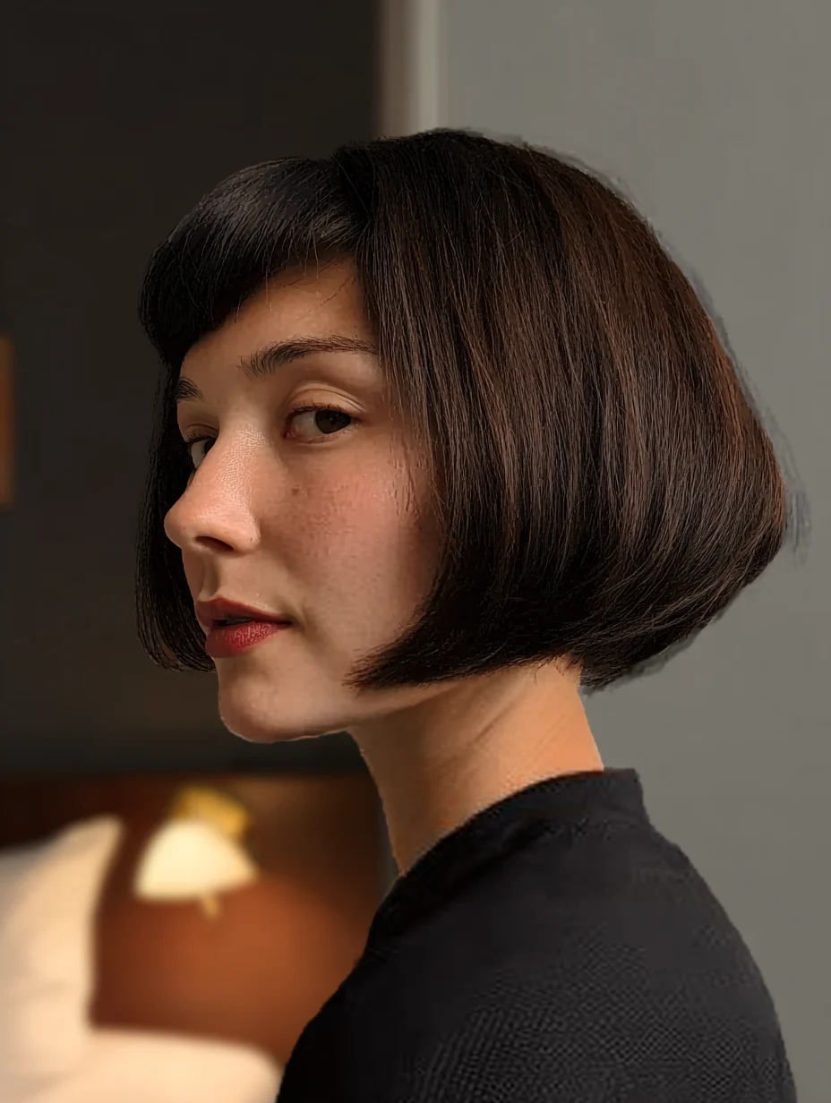 This short bob with side-swept bangs softens the face while supporting its natural proportions. The bangs move gently across the forehead, adding shape without overpowering the overall cut.