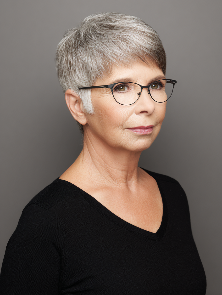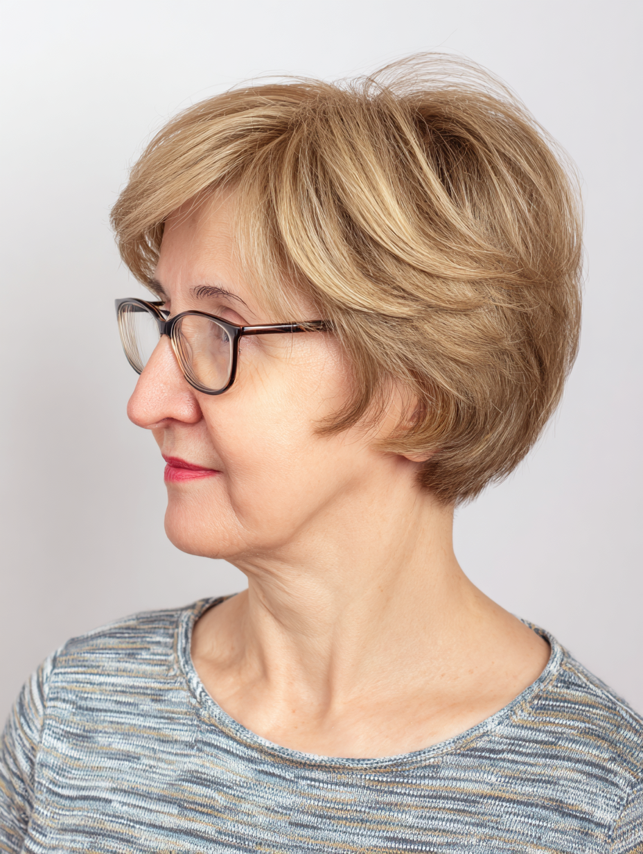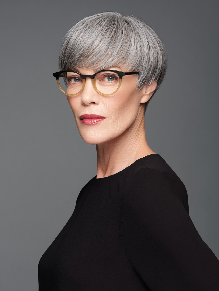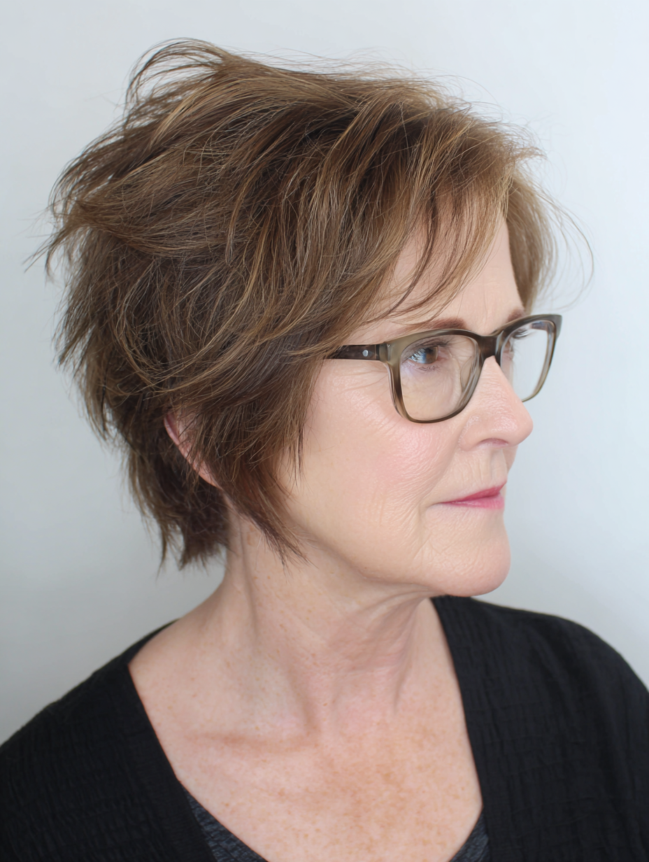 A short pixie bob with gentle volume pairs beautifully with glasses by keeping the face open and balanced.