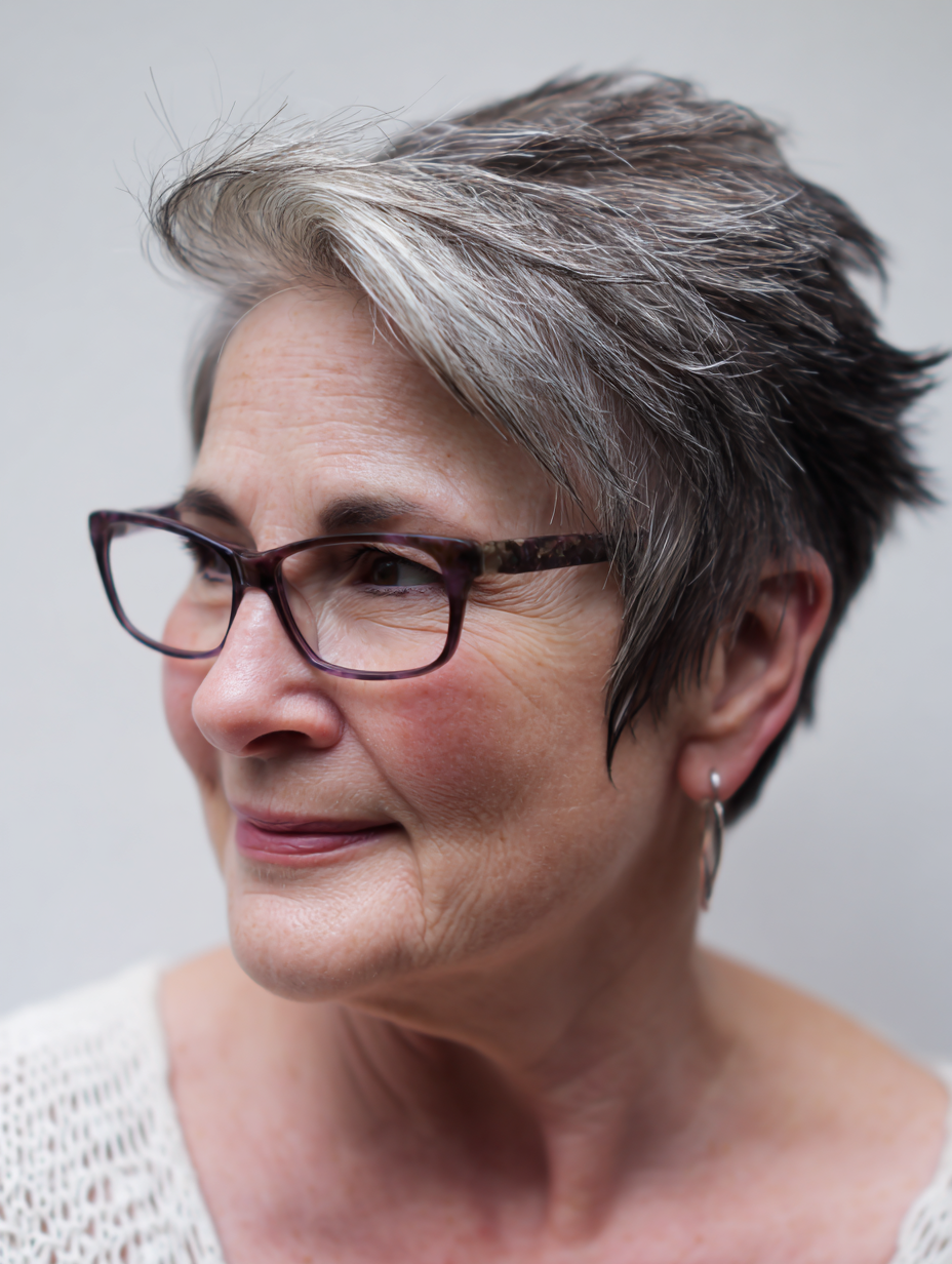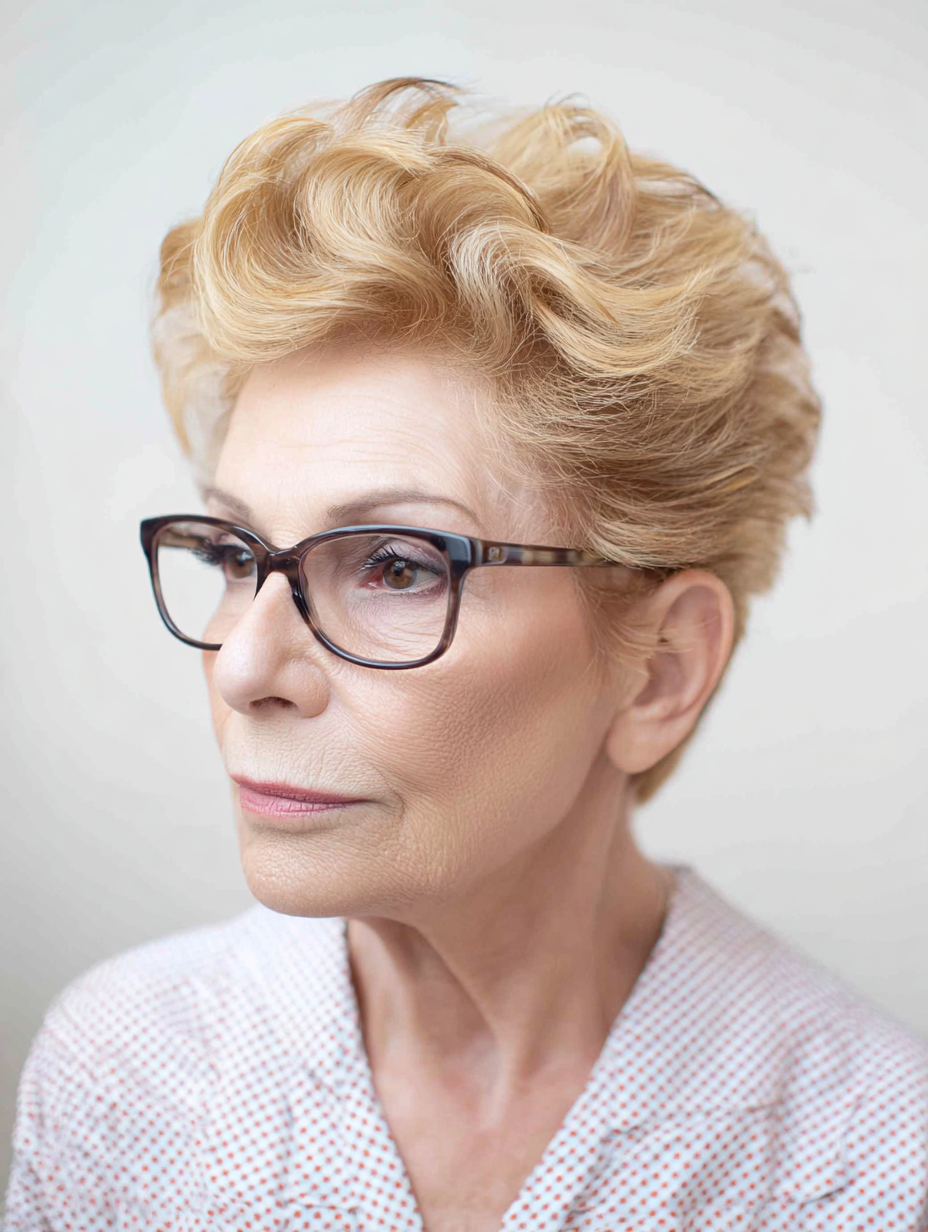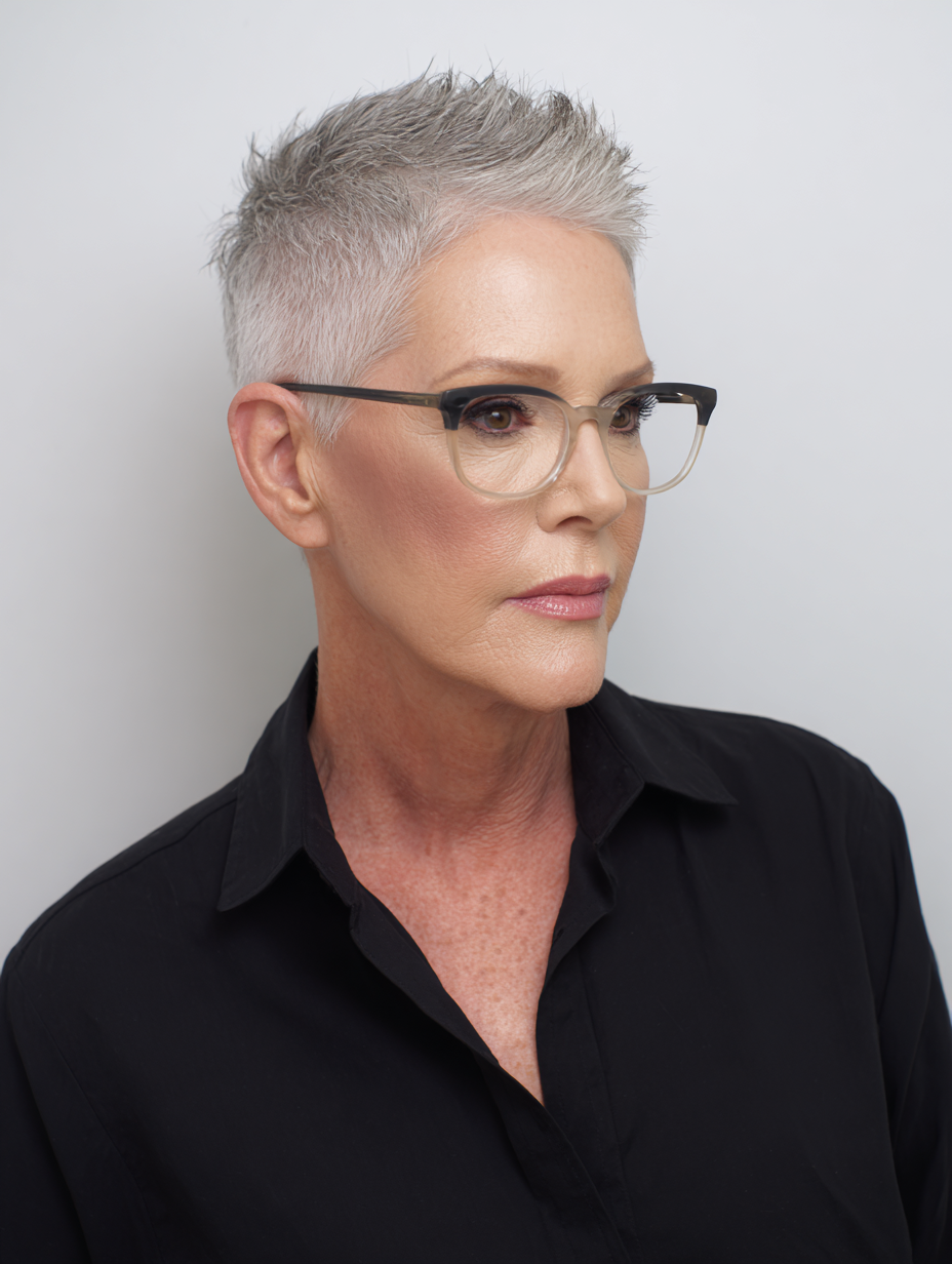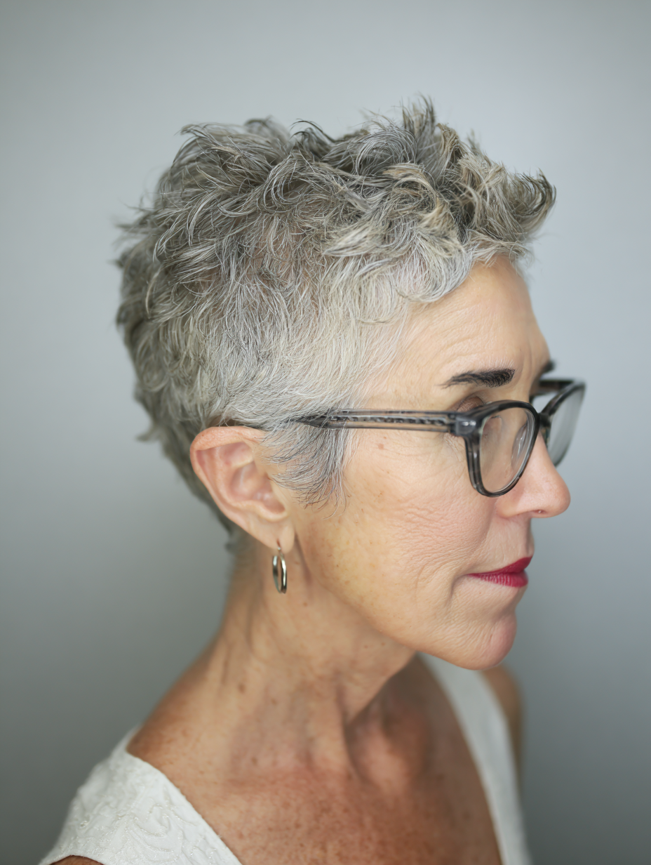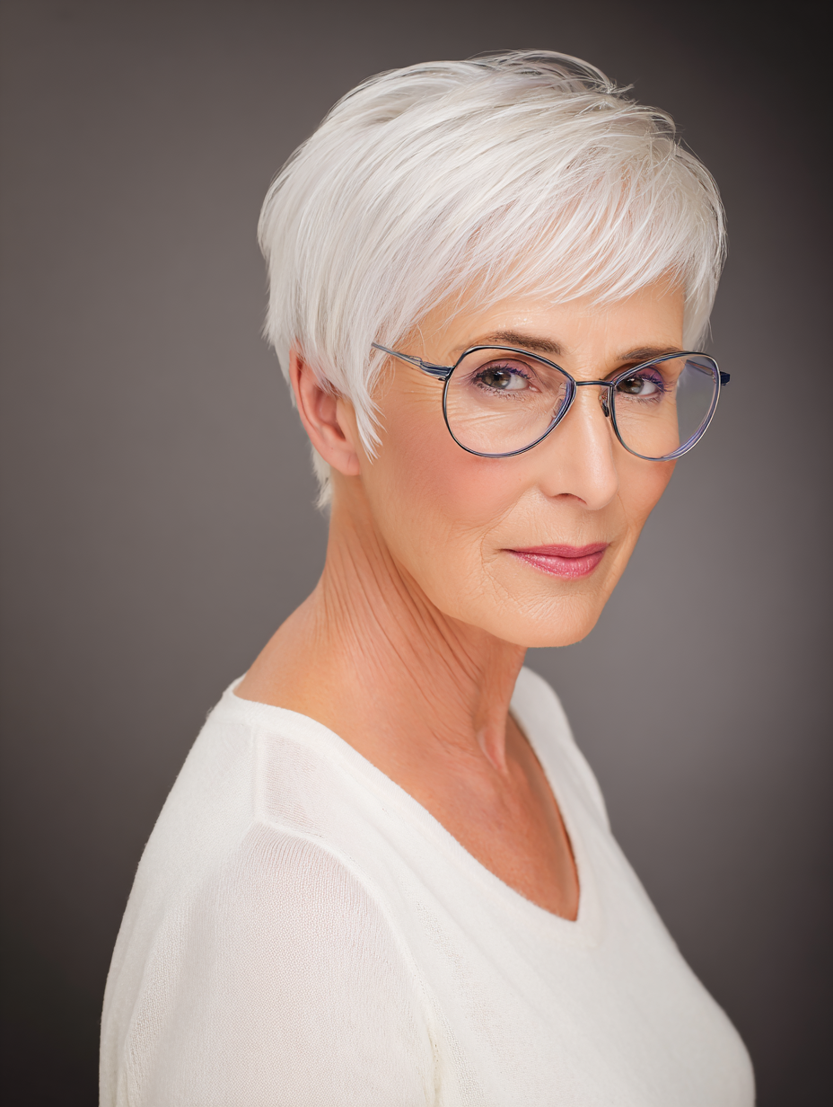 A short pixie bob with gentle volume pairs beautifully with glasses by keeping the face open and balanced.